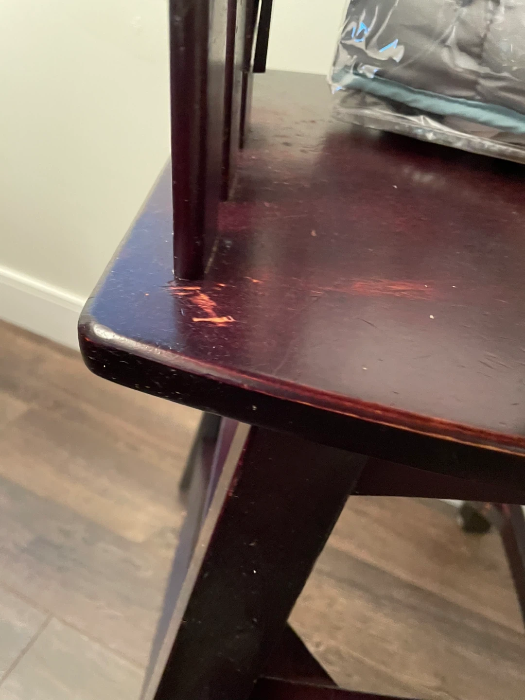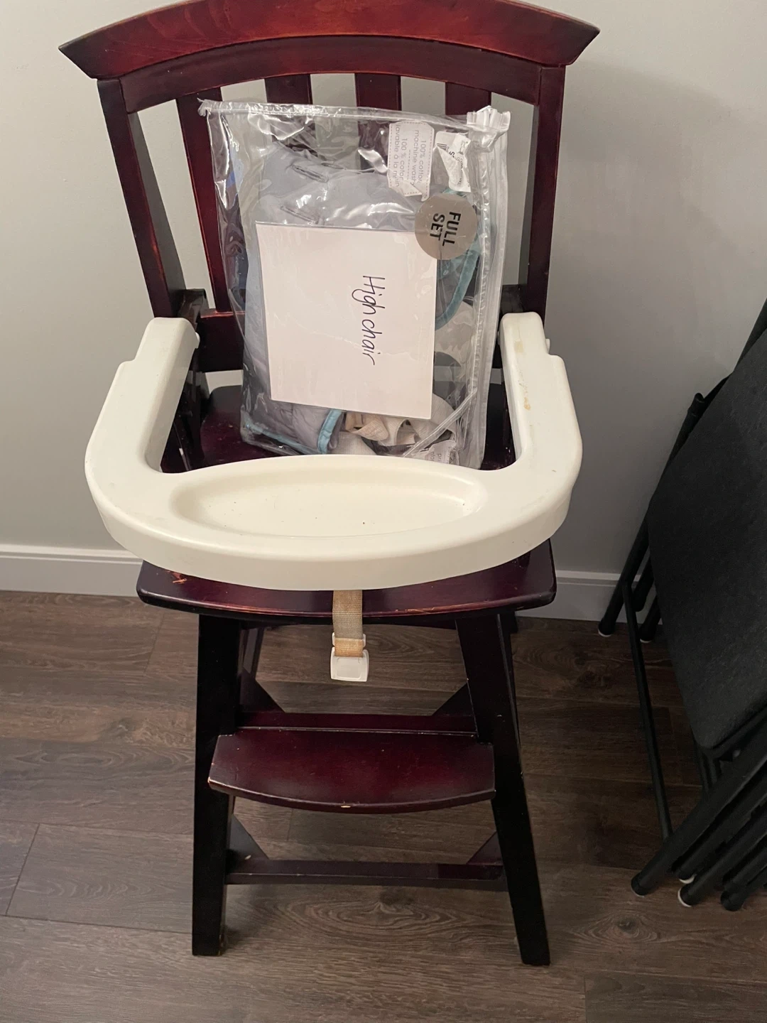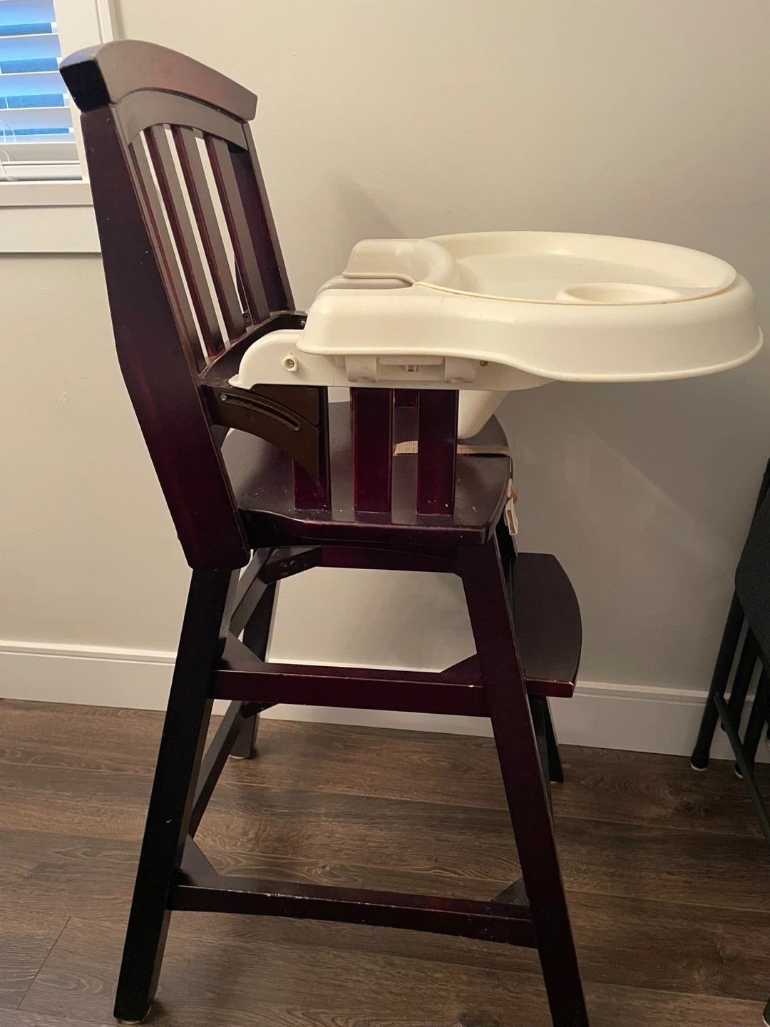 Summer Infant high chair with a dark wood finish. There are some visible scratches on the wood, but the chair is still sturdy and functional. It comes with a full seat set. Tray is removable for easy cleaning. Chair also reclines. Smoke free and pet free home.
