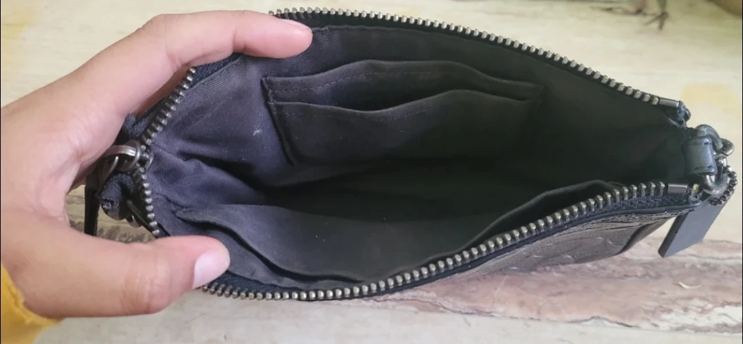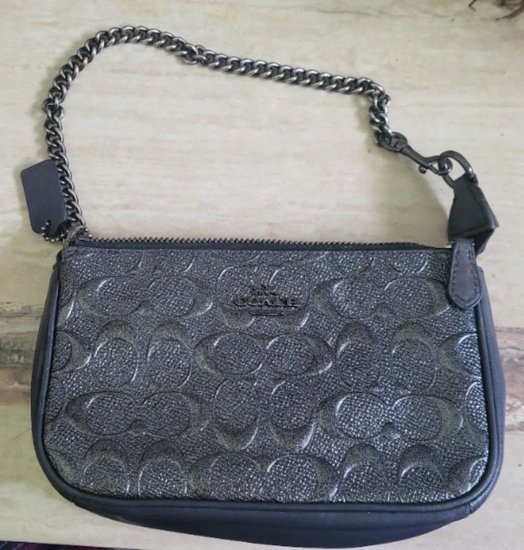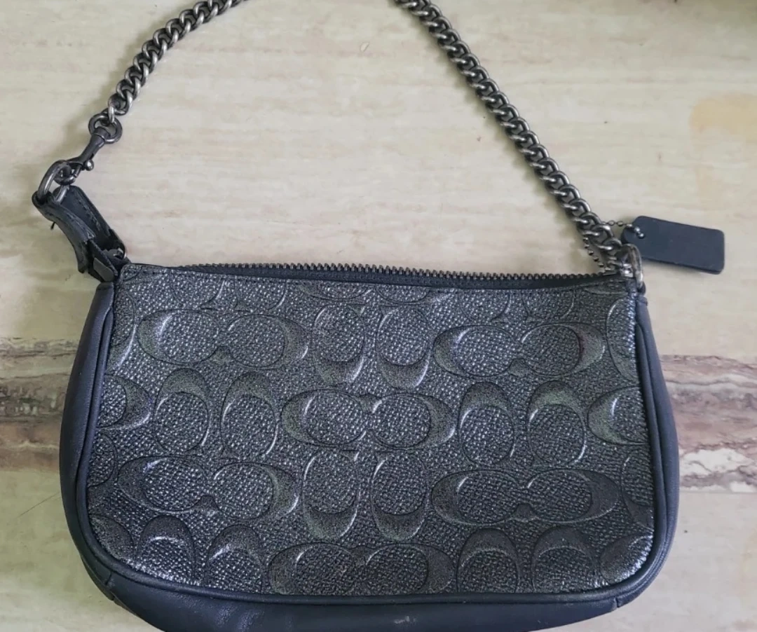 Selling a cute Coach black leather pouch with a chain. It's in good condition and perfect for carrying essentials. The chain adds a touch of style!