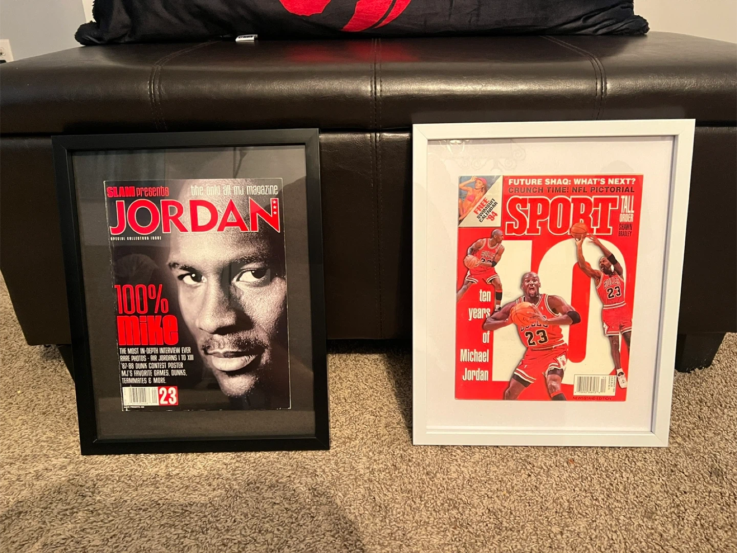 Selling two framed Michael Jordan magazine covers. One is a SLAM magazine special collector's issue featuring Jordan, and the other is a SPORT magazine cover with a 'Future Shaq' headline.