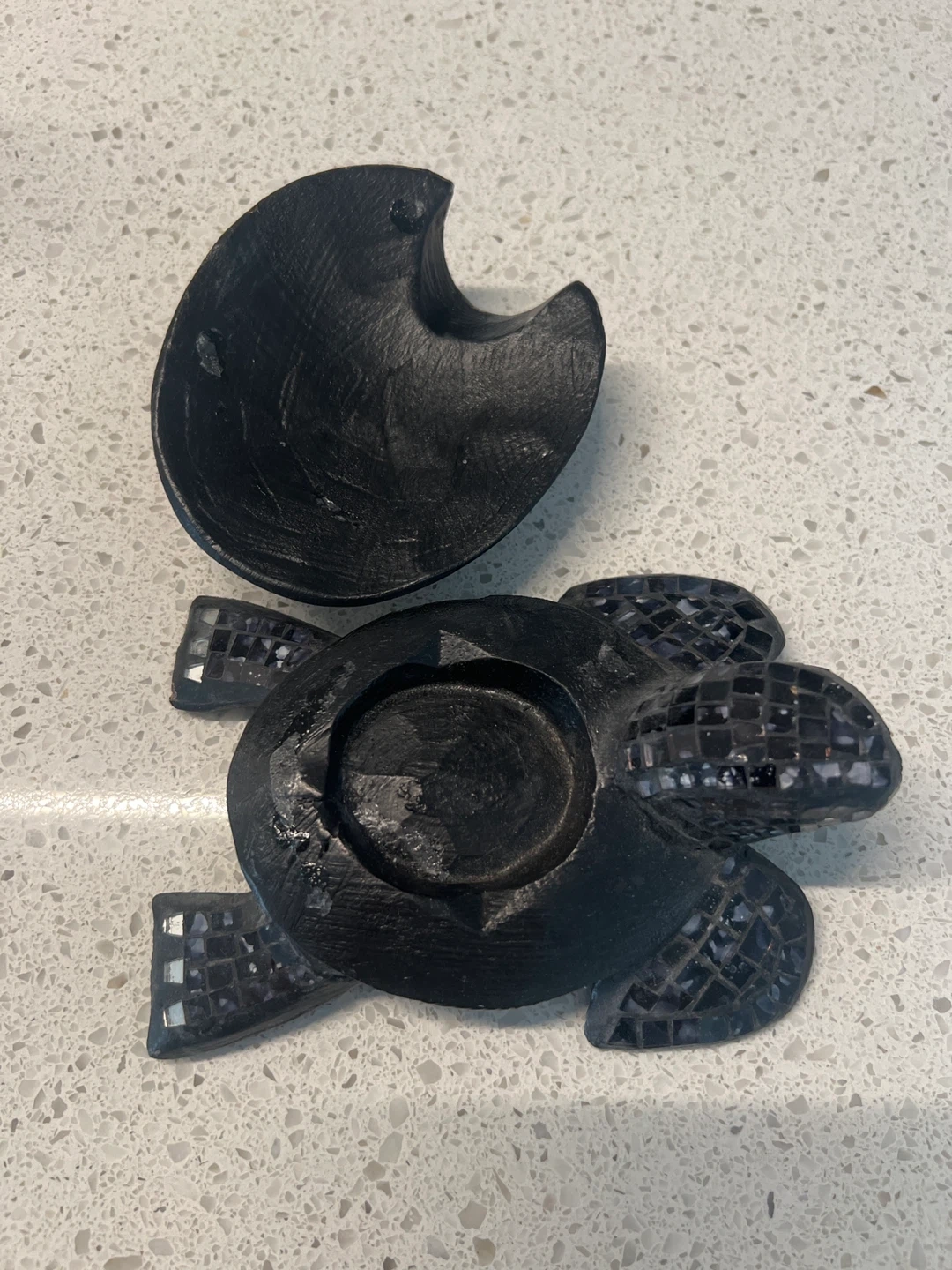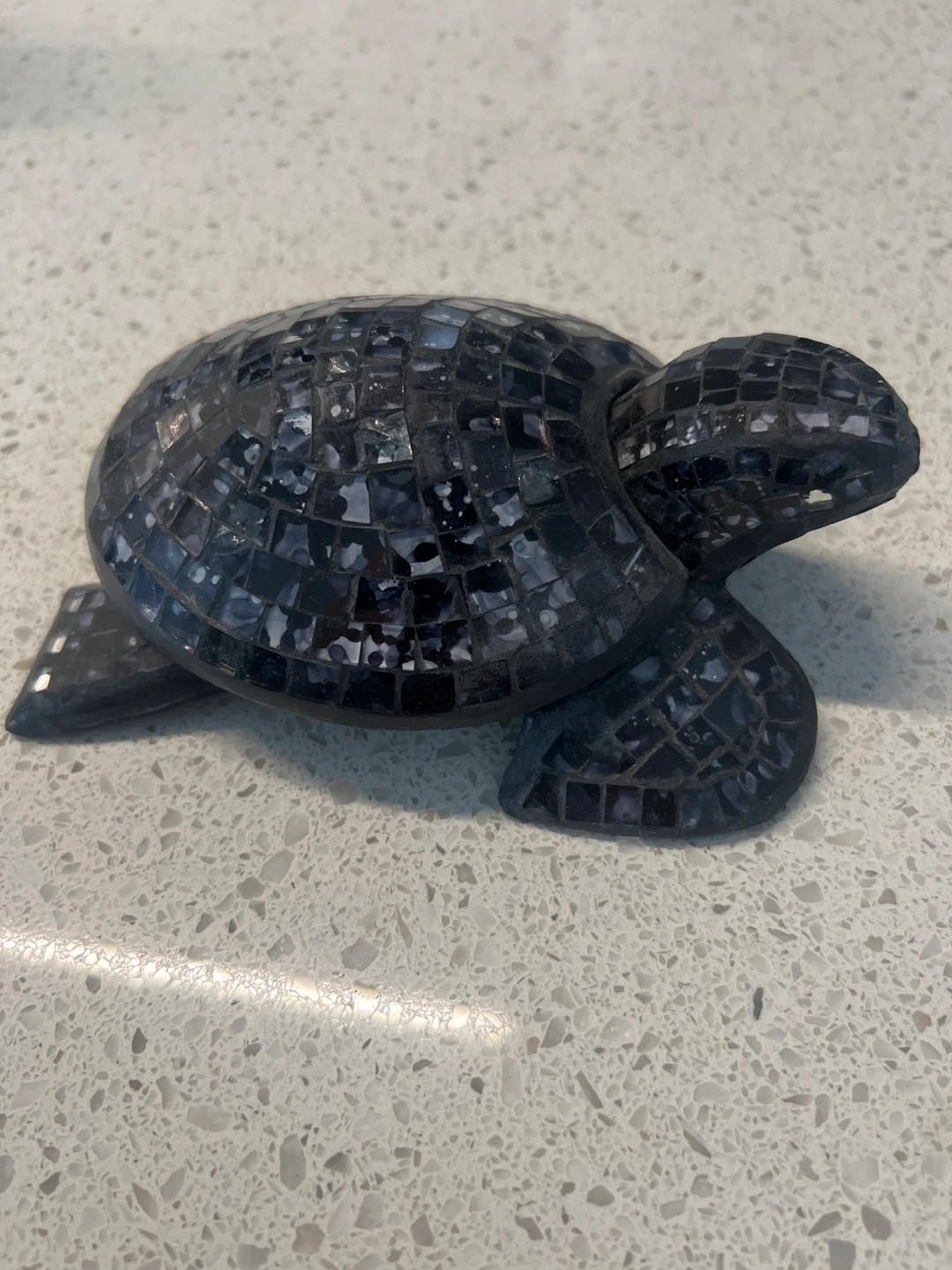 Cute turtle trinket box in black hand crafted from Costa Rica! It has a mosaic tile design on the turtle's shell and flippers. The top part of the turtle comes off to reveal a small storage space inside. Perfect for storing small items or as a decorative piece.