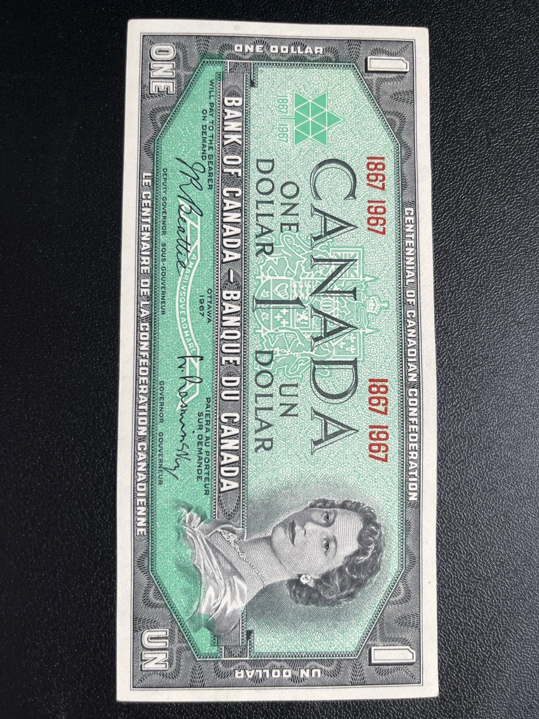 Selling a 1967 Canadian one dollar bill commemorating the Centennial of Canadian Confederation. It features a unique design from the Bank of Canada.