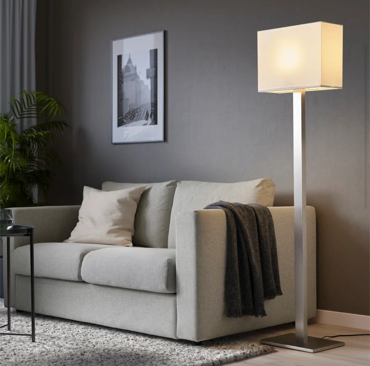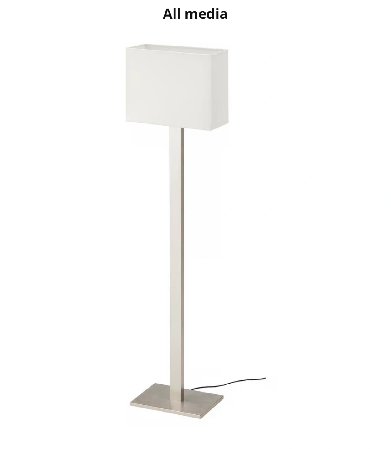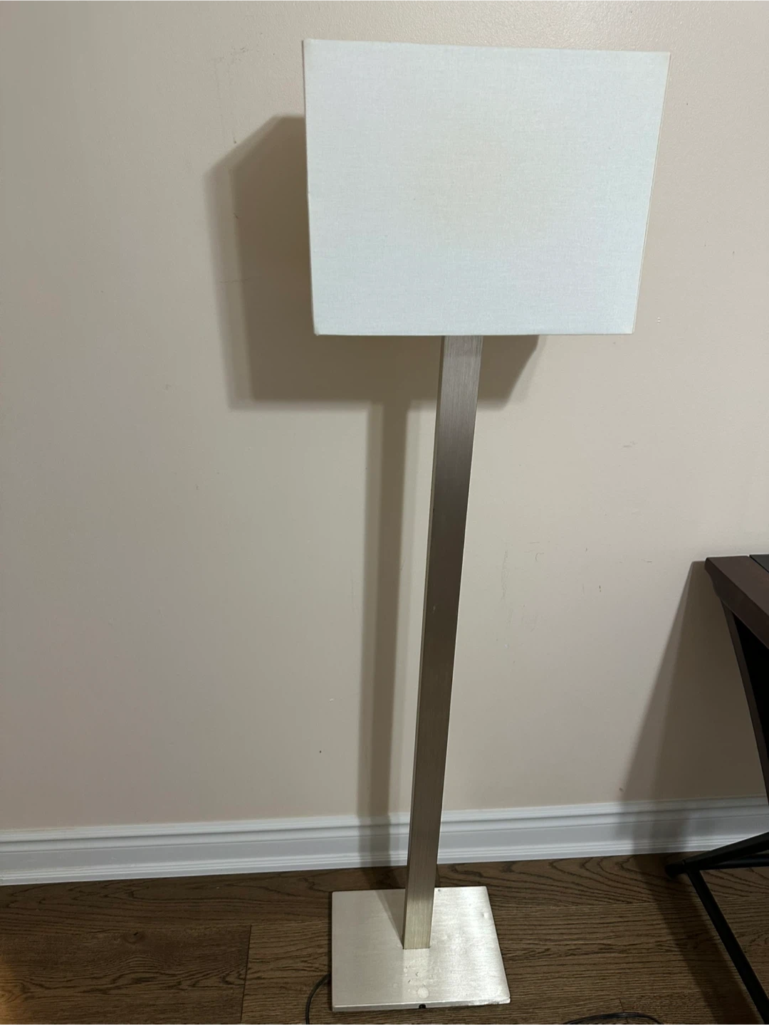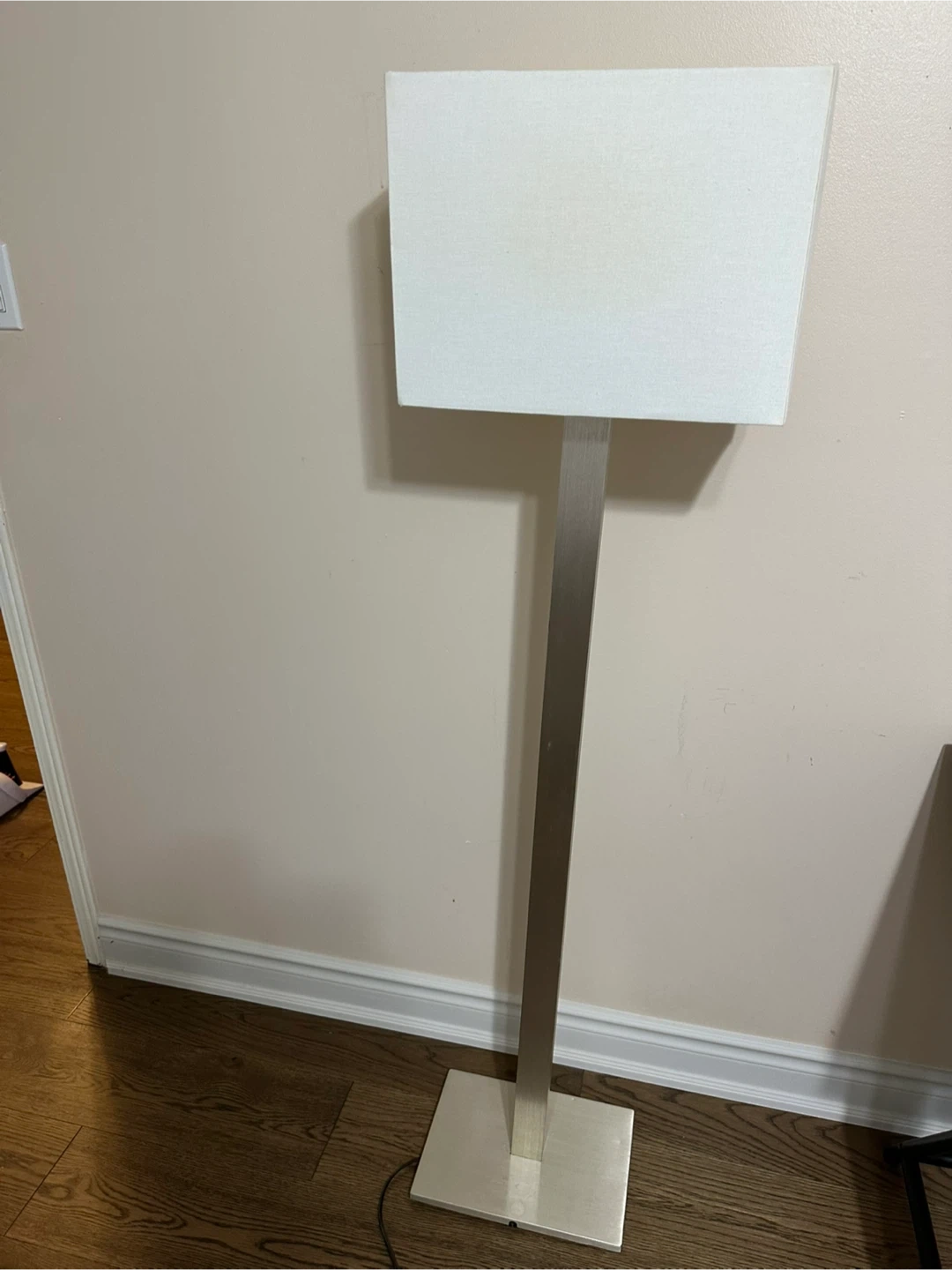 This is a modern floor lamp with a silver metal base and a white rectangular shade. It's in great condition and would look great in any living room or bedroom.