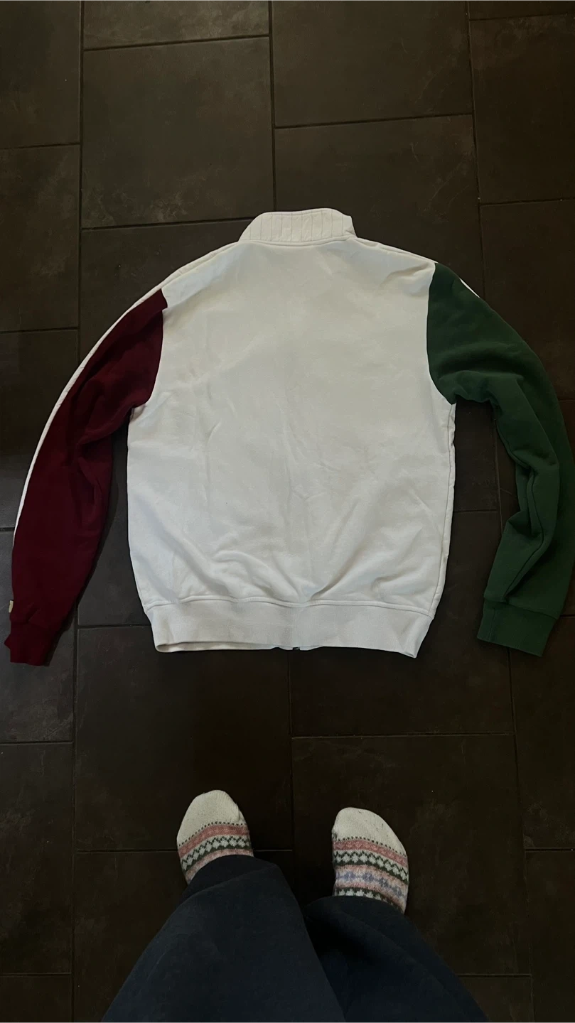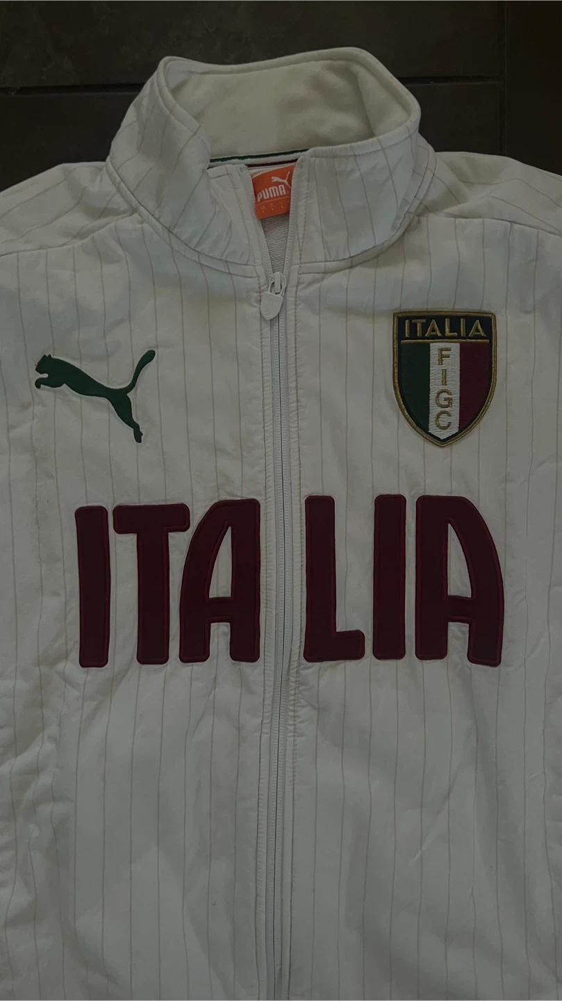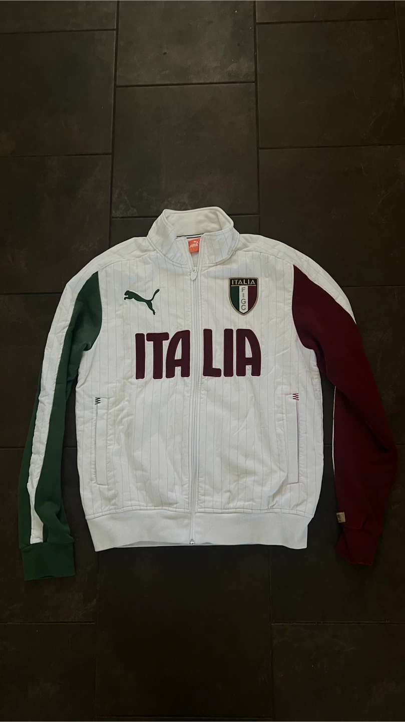 Selling a Puma Italia track jacket. It's white with green and burgundy sleeves and features the Italia logo on the front. The size tag indicates a size L.