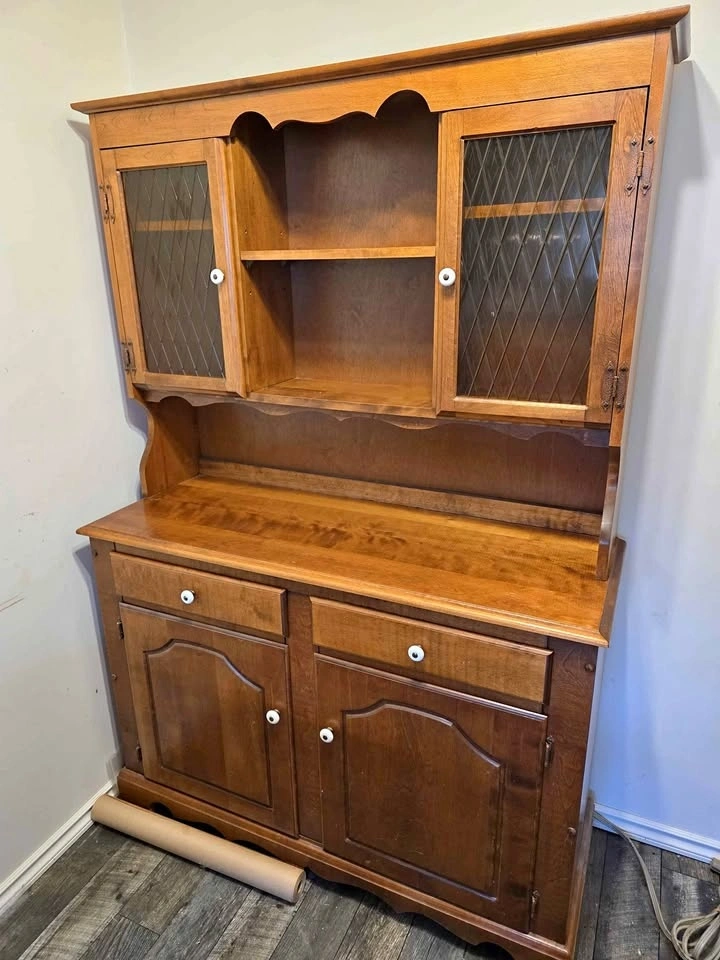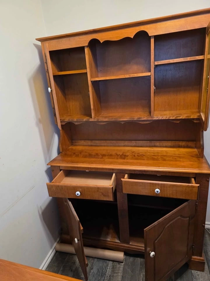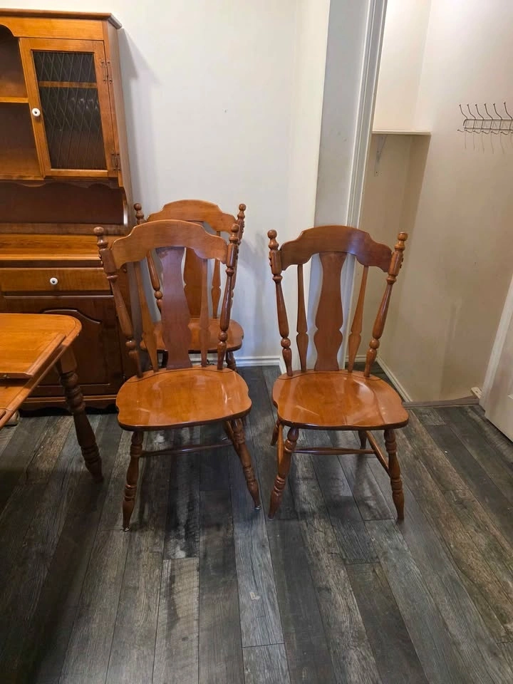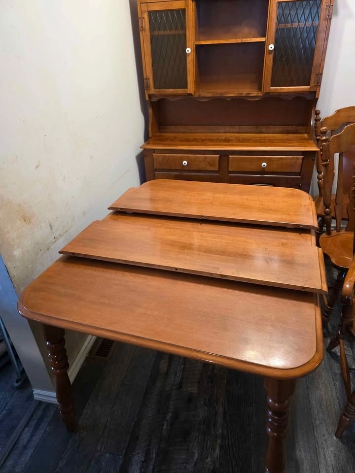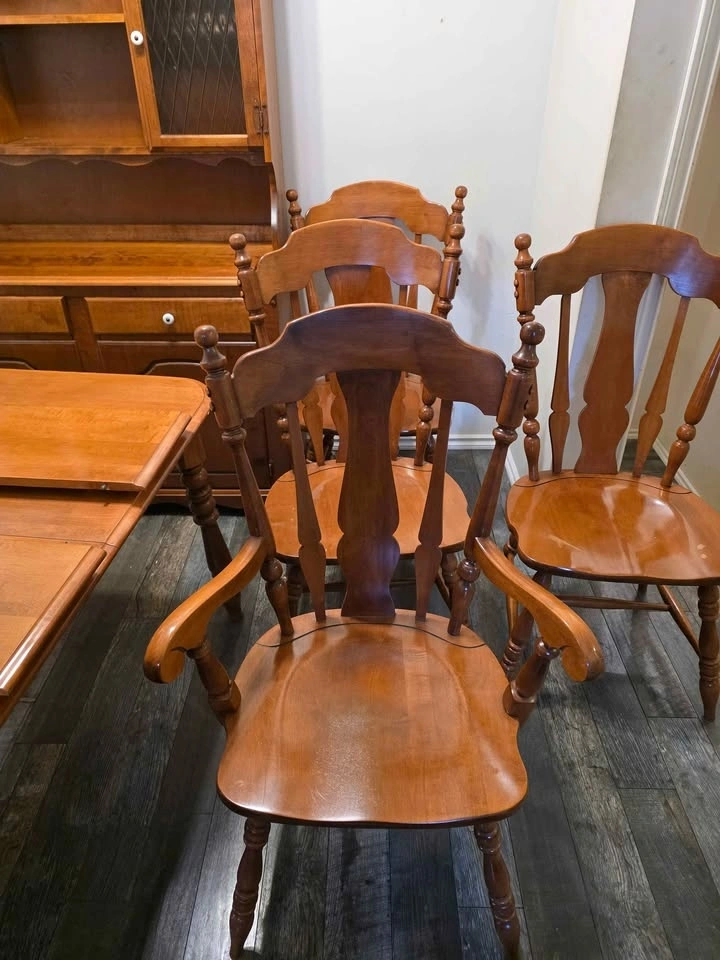 Dining room suite, solid maple, medium toned finish. China cabinet/hutch, table with 2 leafs/extensions. Two captains chairs and 4 regular (not all chairs are in the picture).