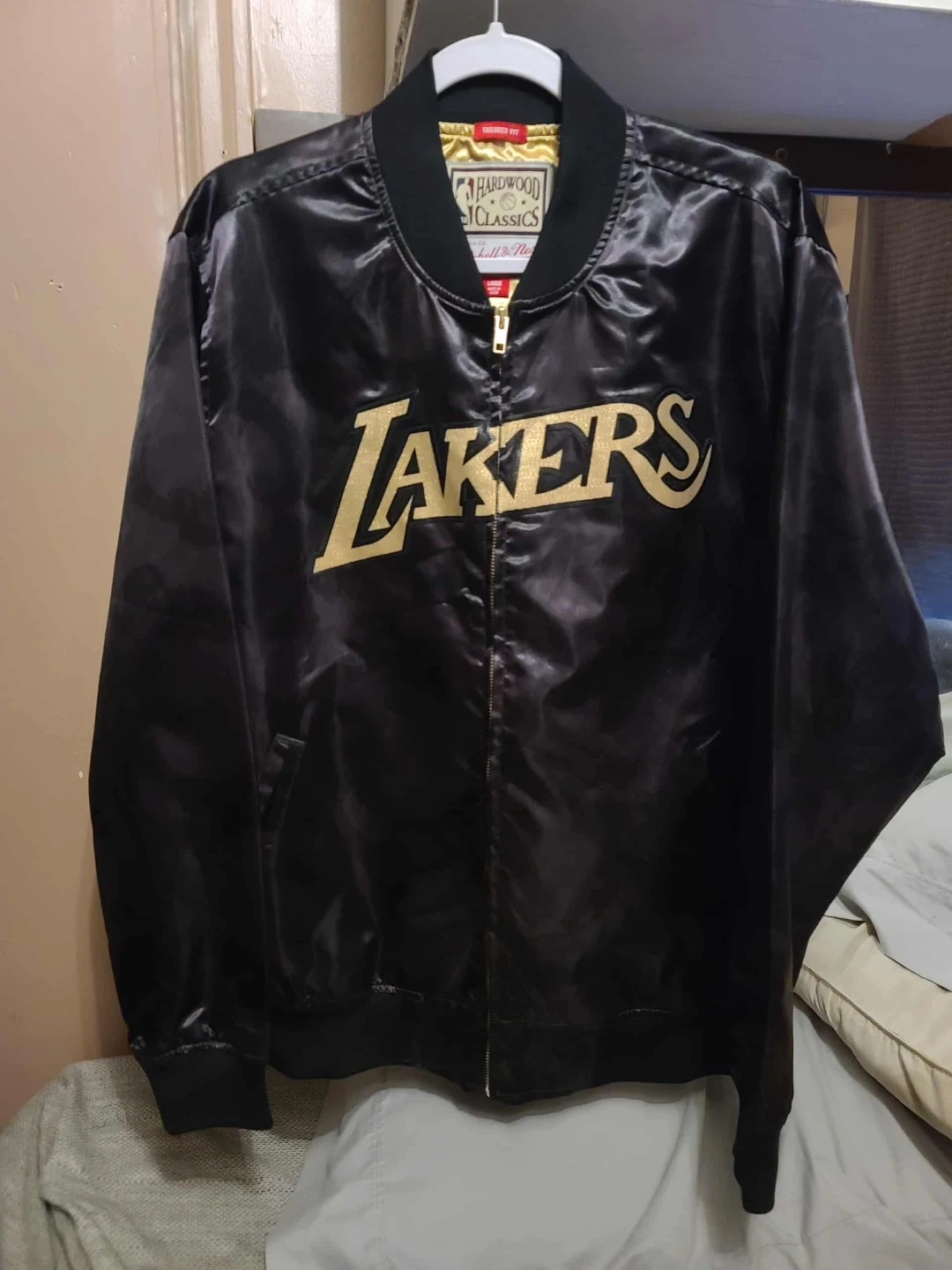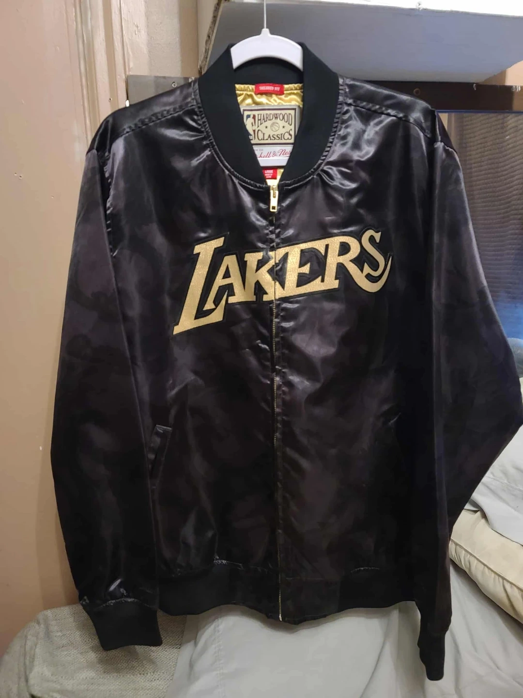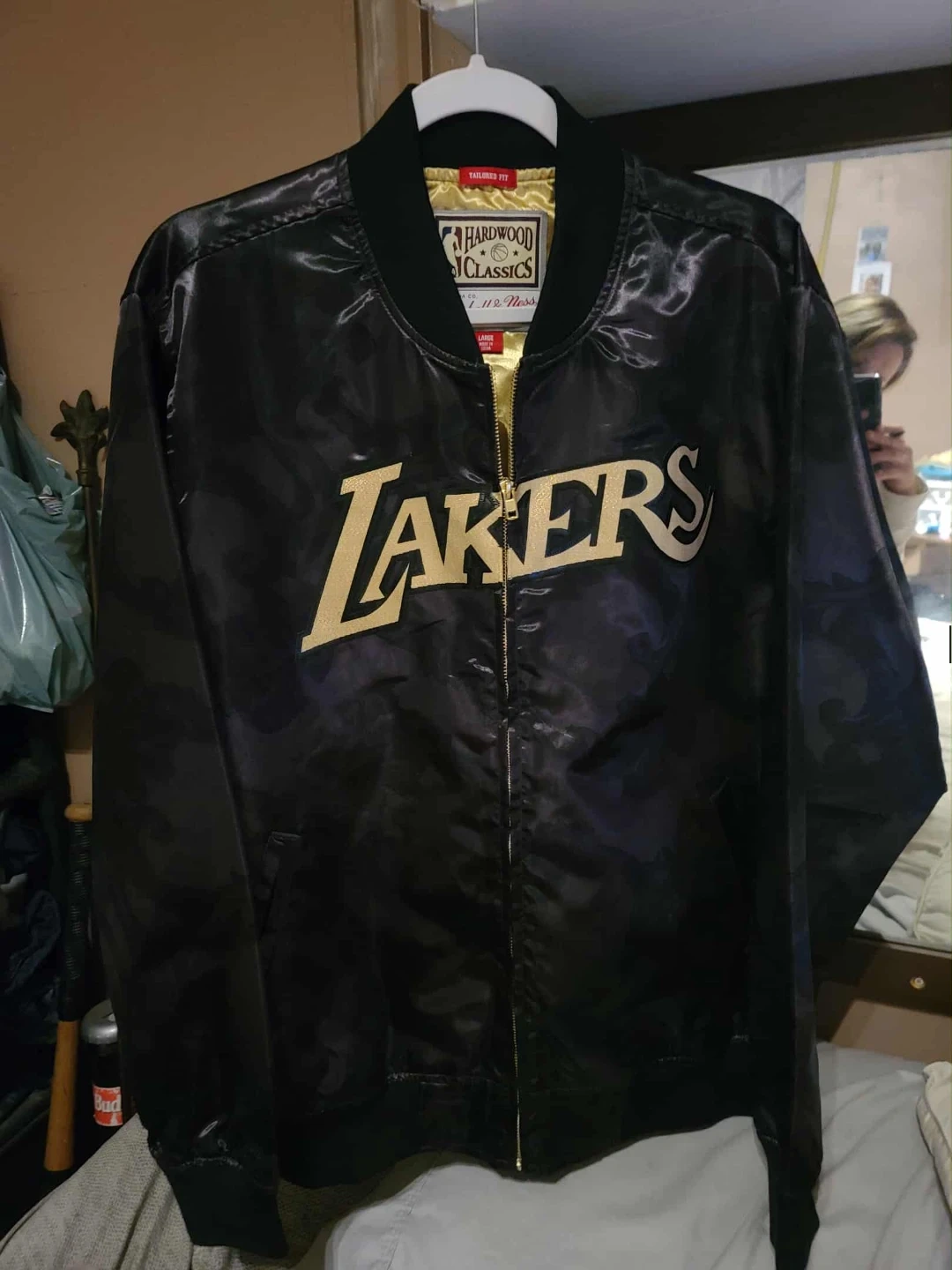 Selling a Mitchell & Ness Hardwood Classics Satin Camo grated special collectors edition Lakers jacket in size large! The jacket is black with gold accents and features the Lakers logo on the front. It's in great condition and perfect for any Lakers fan! Authentic !
