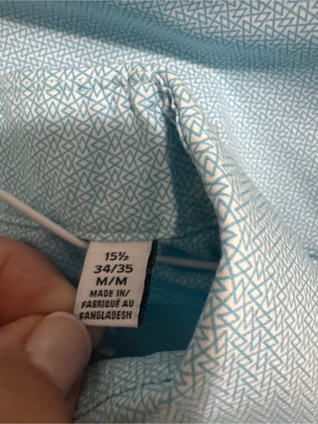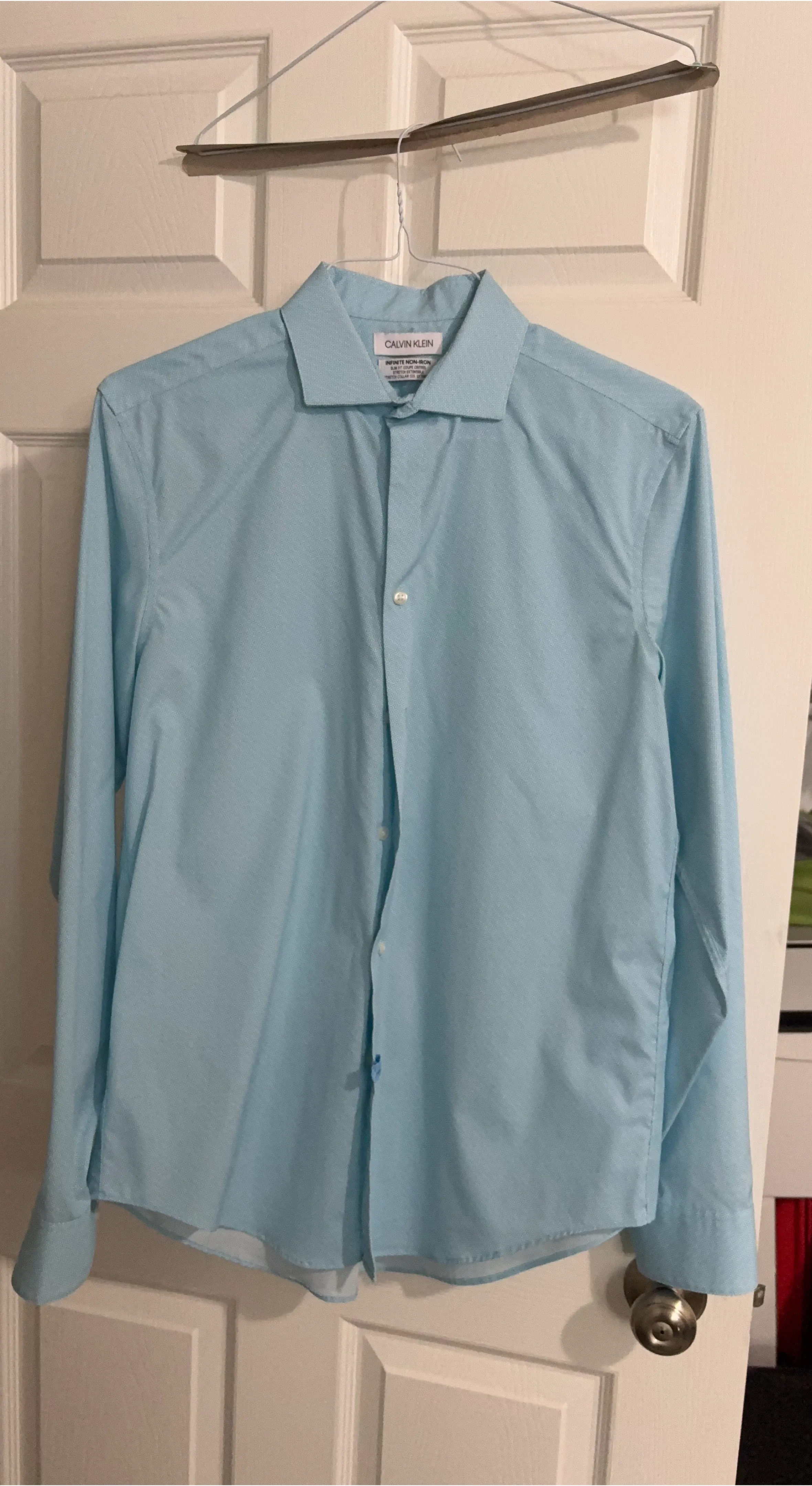 Here's a Calvin Klein dress shirt in size 15 1/2 34/35! It's a light blue colour with a subtle geometric pattern. The material feels nice and it's in great condition