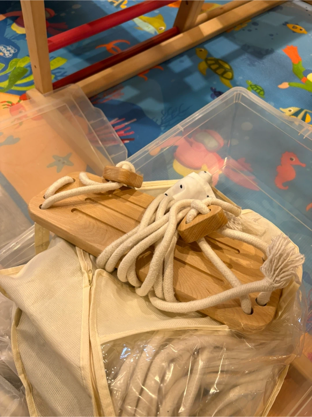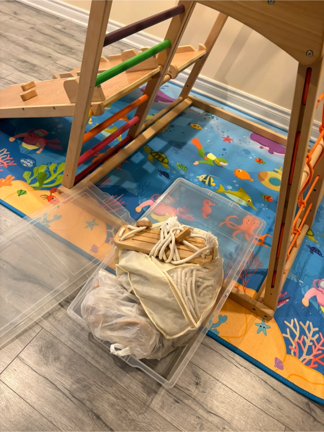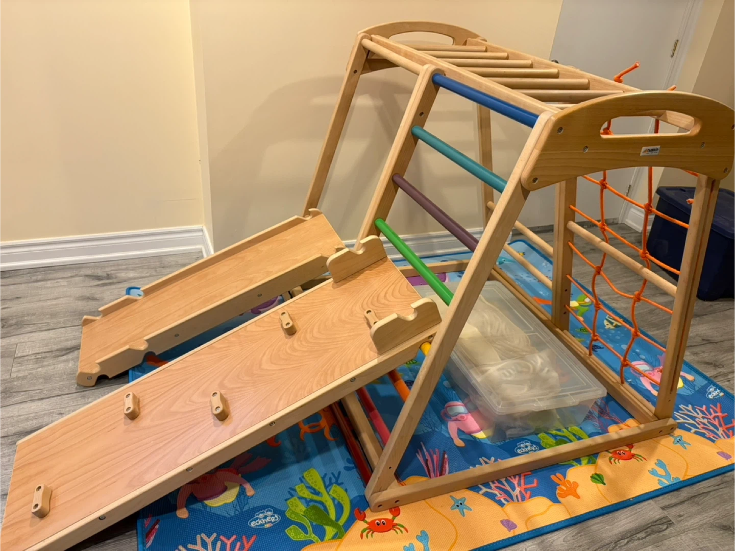 This set includes the triangle climber, slide, swings, and rope ladder, all in great condition. It's perfect for indoor active play and helps develop your little one's motor skills and coordination. Comes with all the pieces.