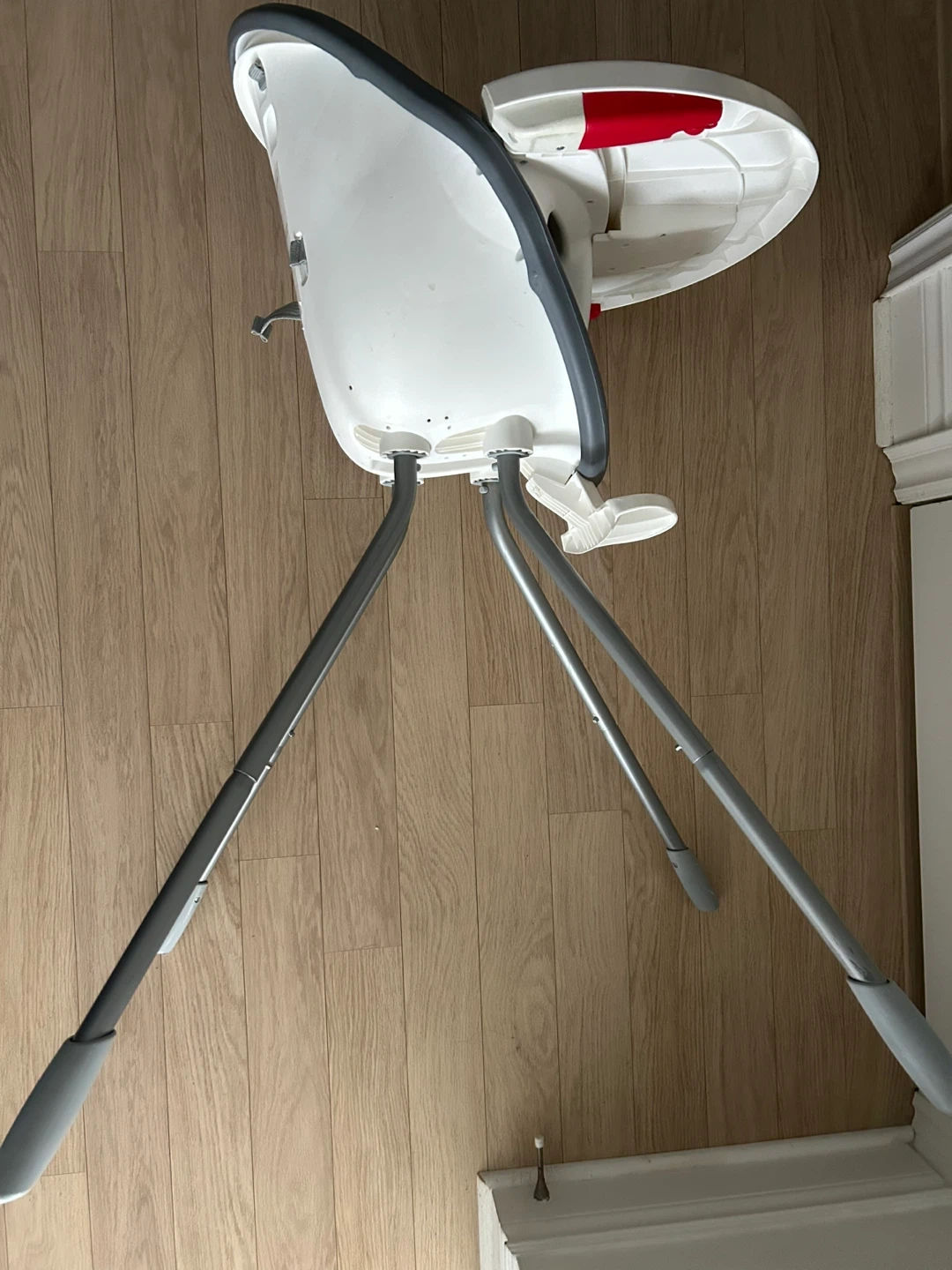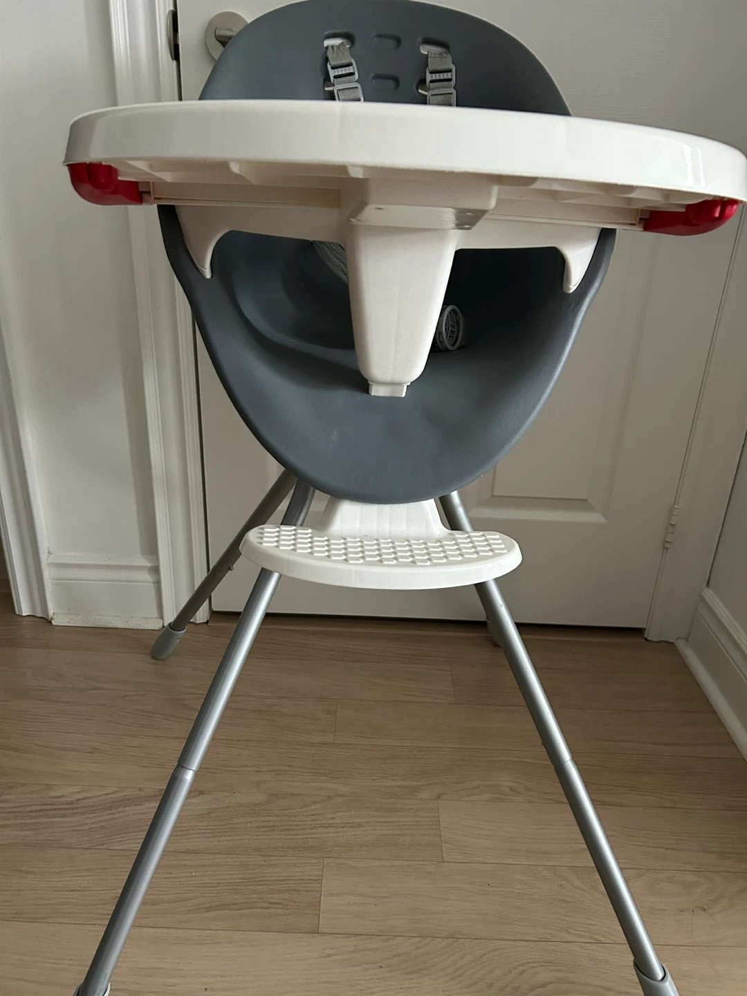 Selling a used highchair with tray in good condition. It's grey and white, perfect for meal times. The highchair is designed for easy cleaning and has a smooth, seamless design. The tray is also removable for convenience!