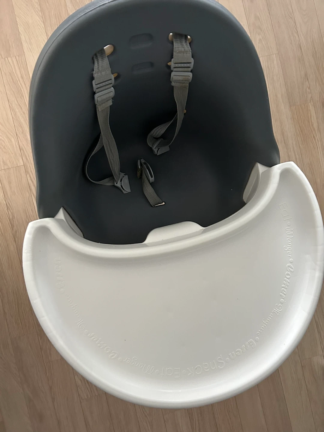 Selling a used highchair with tray in good condition. It's grey and white, perfect for meal times. The highchair is designed for easy cleaning and has a smooth, seamless design. The tray is also removable for convenience!