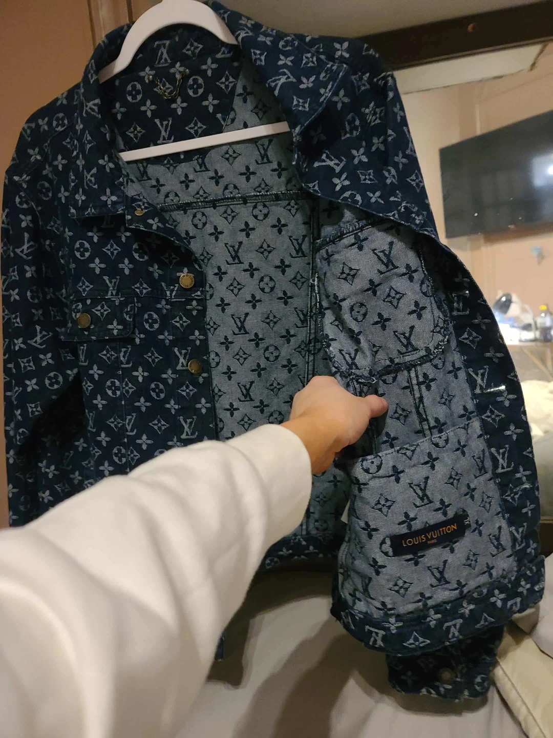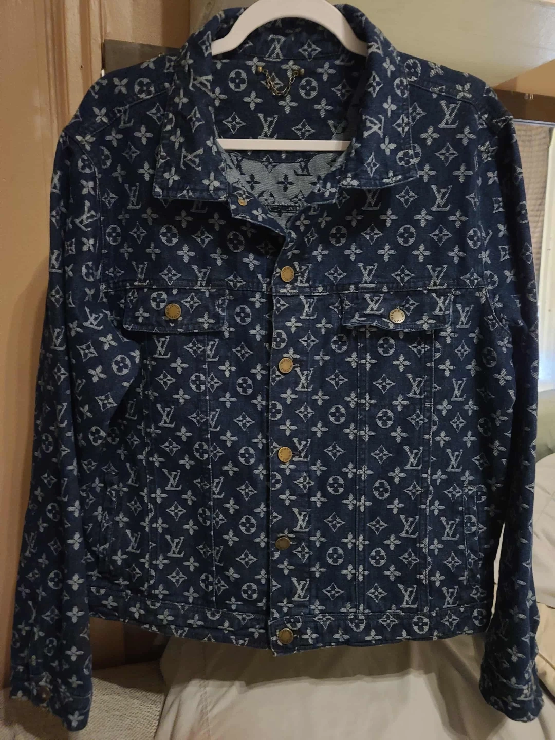 Selling a stylish Louis Vuitton denim jacket! It features the iconic LV monogram pattern throughout. The jacket has a classic cut and is made of durable denim material. Perfect for adding a touch of luxury to your everyday look!