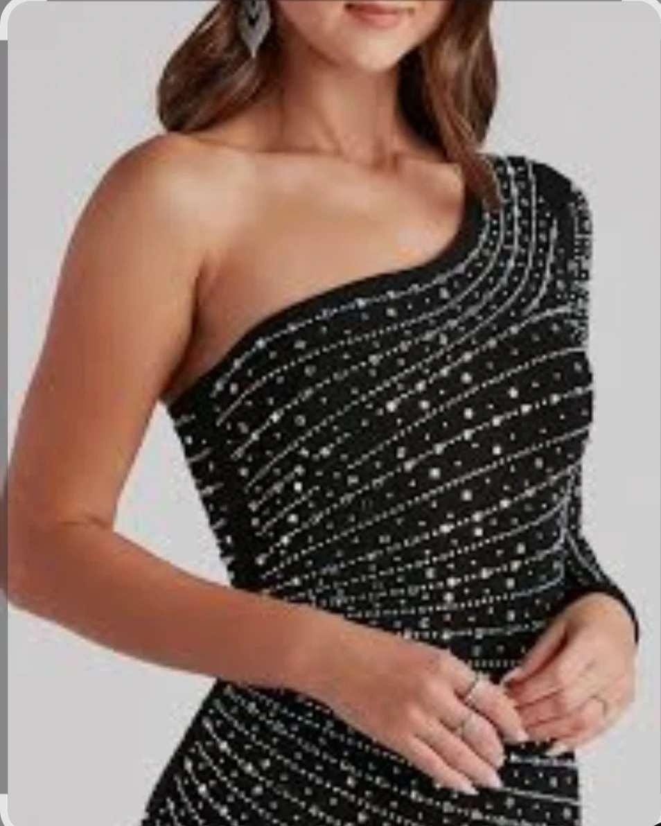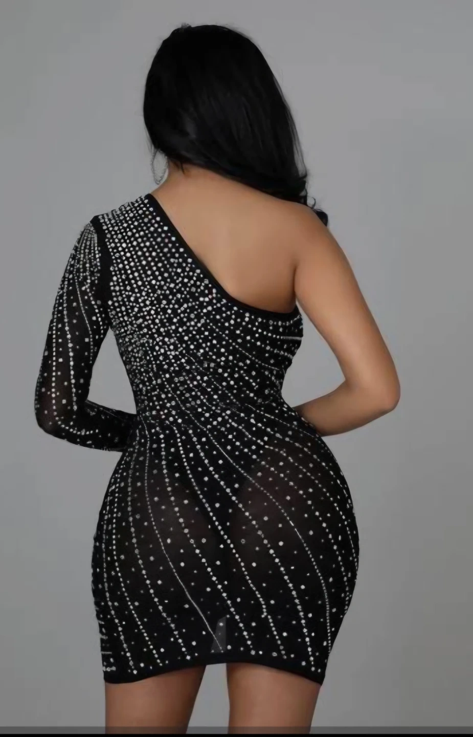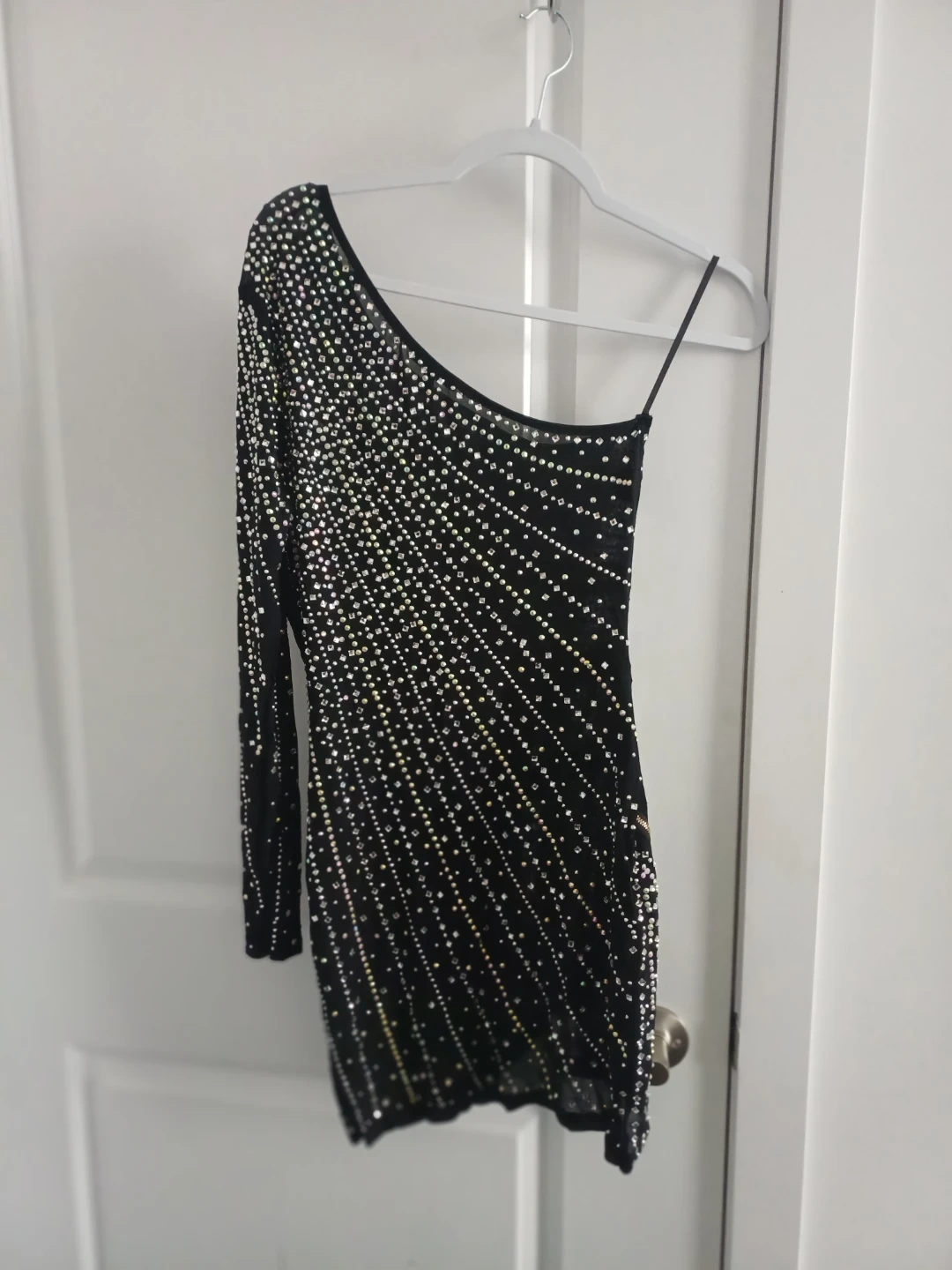 Selling a stylish one-shoulder mini dress! Formal short jeweled one- shoulder form fitting black dress. It's black and features embellishments and zipper details. Perfect for a night out or special occasion. It's new. Never been worn.