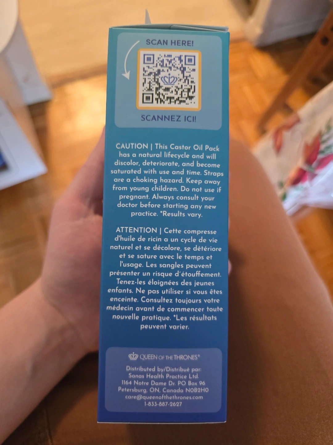 Selling a brand new Queen of the Thrones Castor Oil Pack! It's designed for liver support and is made in Canada. This pack features an inner layer of organic cotton flannel and stretchy nylon straps for a comfortable fit. One size fits all! Wash before first use and replace every 2 months