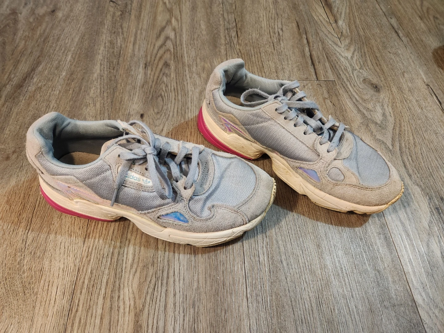 Selling a pair of Adidas Falcon sneakers in grey. They're in good condition and ready for a new adventure!