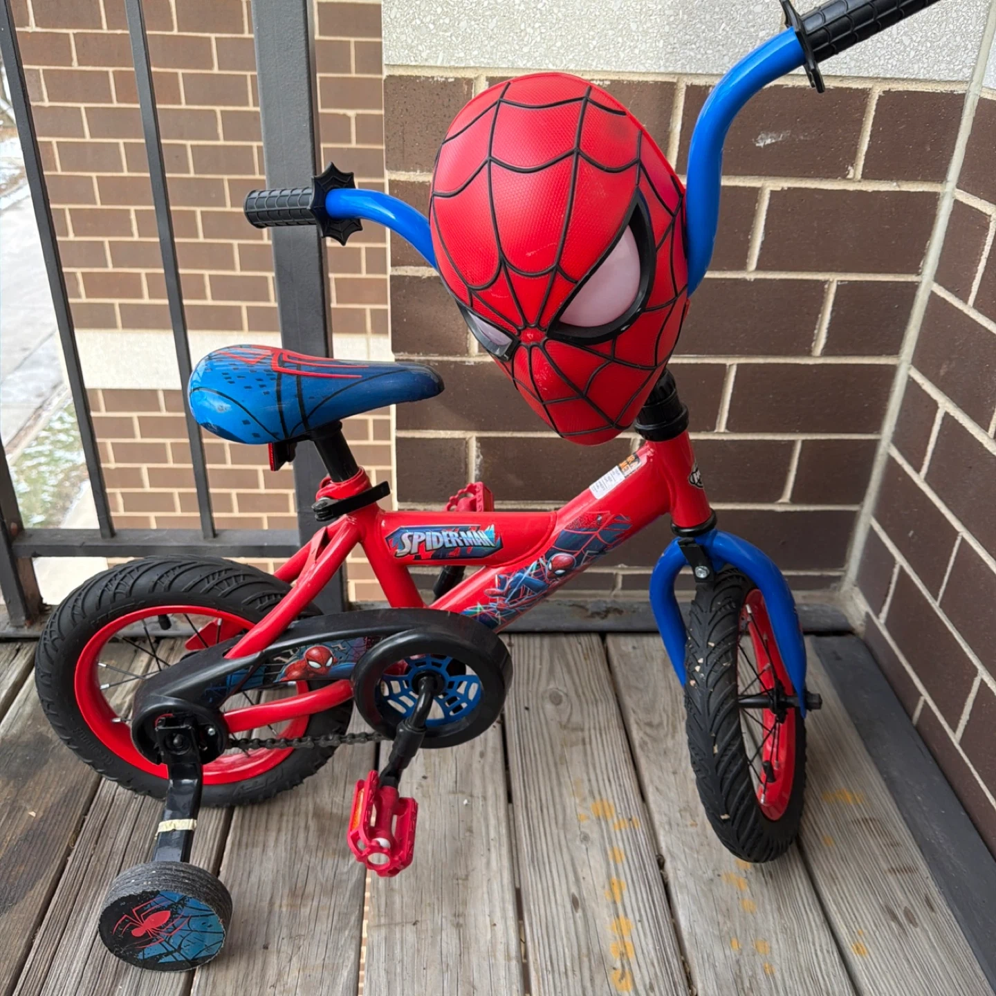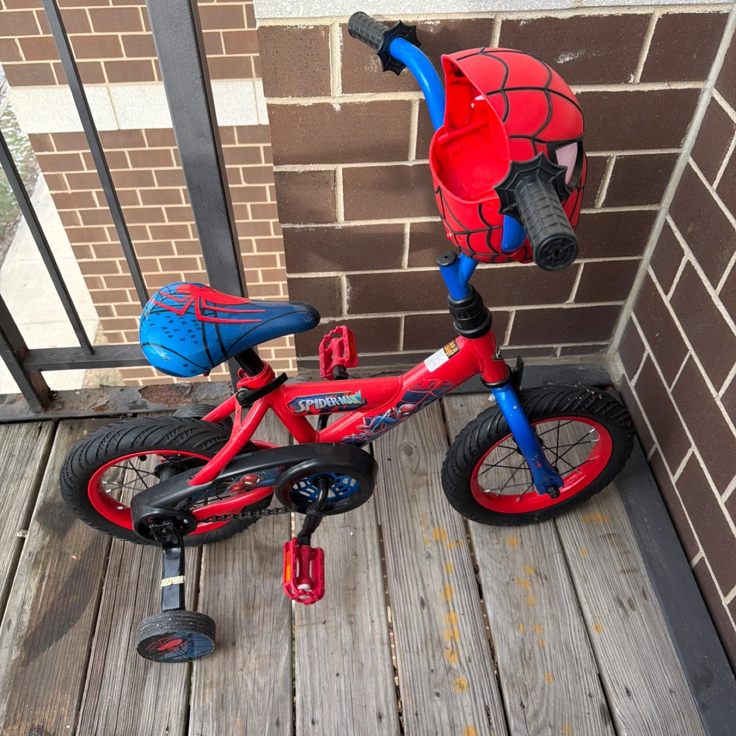 Here's a fun Spider-Man themed bike for kids! It's in good condition and ready for a new rider. Perfect for learning to ride with its training wheels!