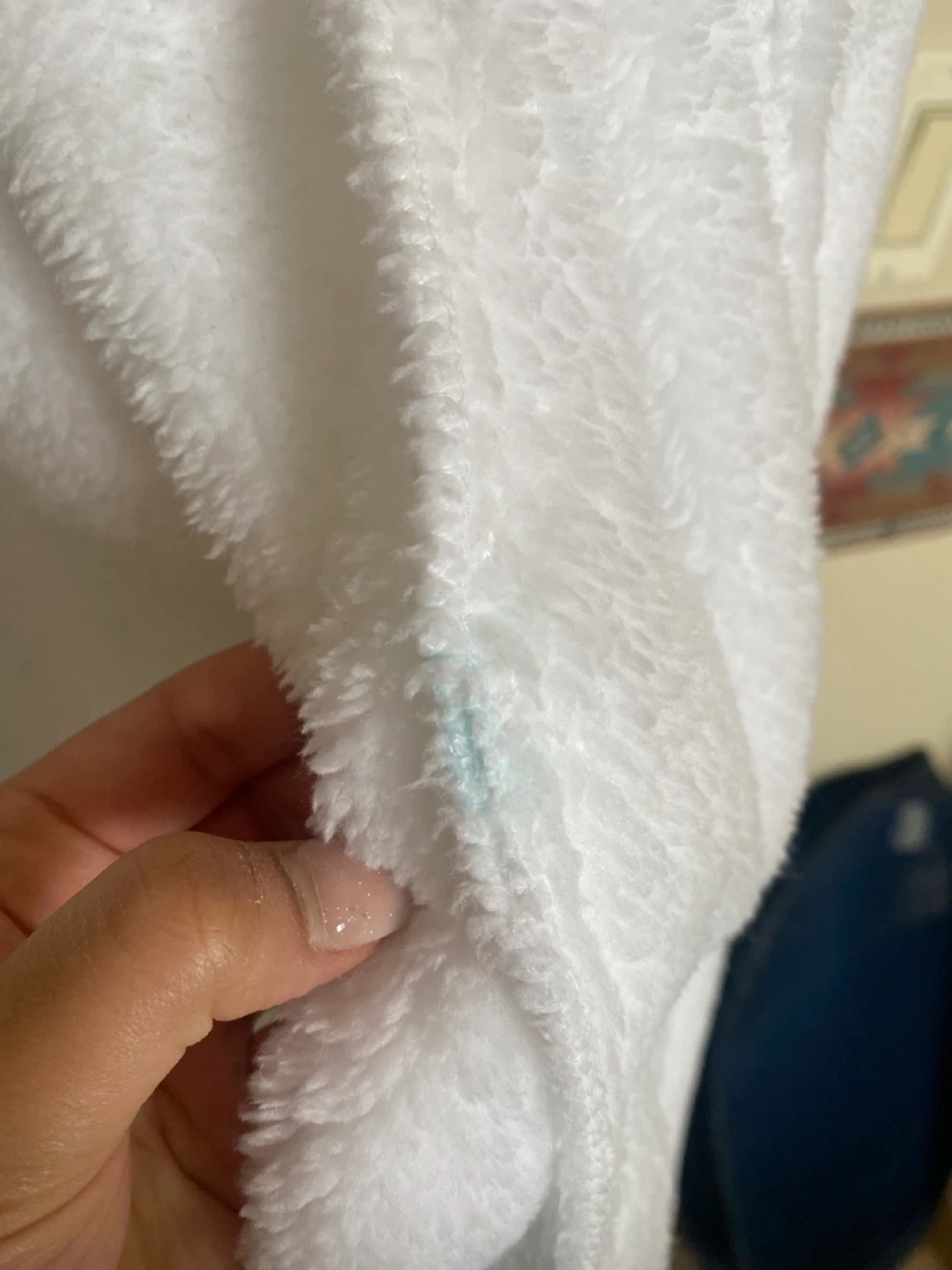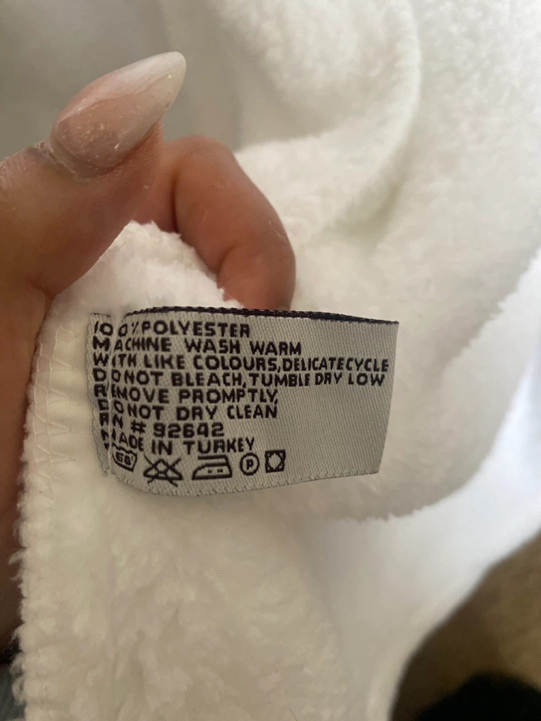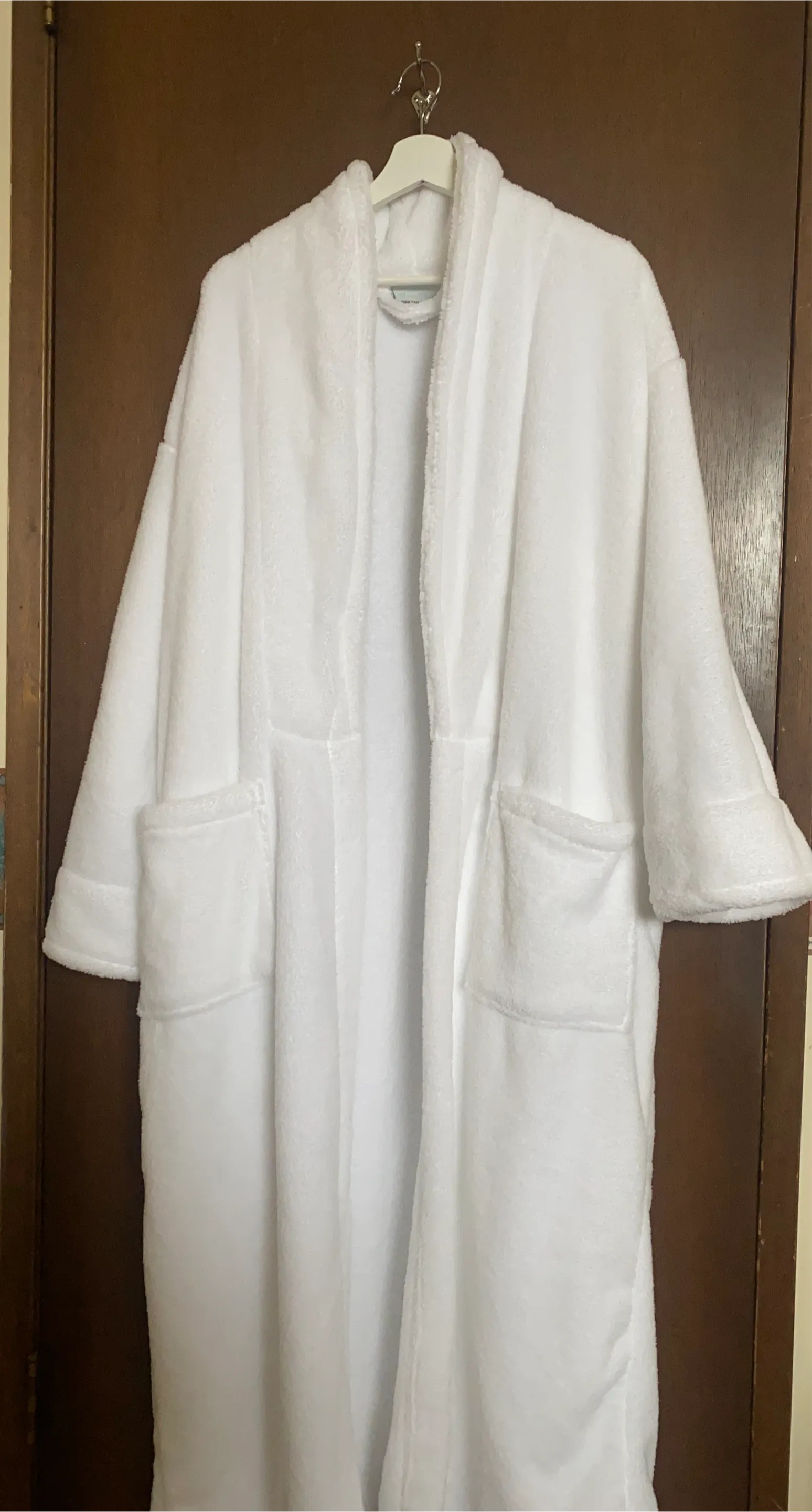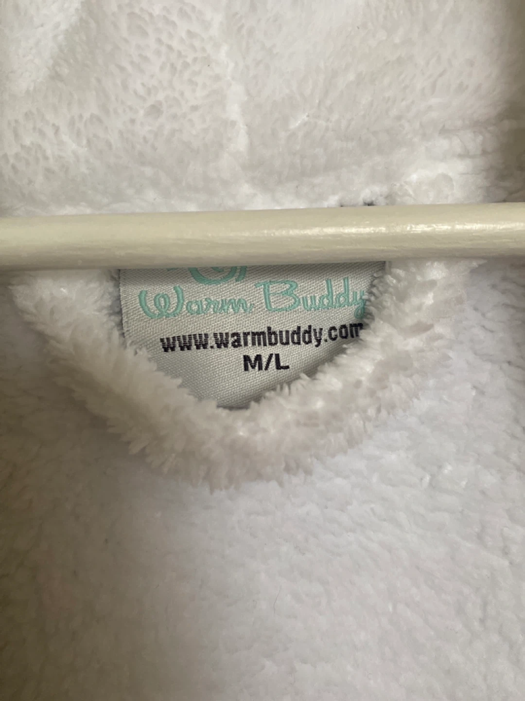 Selling a cozy white robe from Warm Buddy! It's a size M/L and made of 100% polyester. There is a small stain on the robe but it’s never been used because it’s too big.