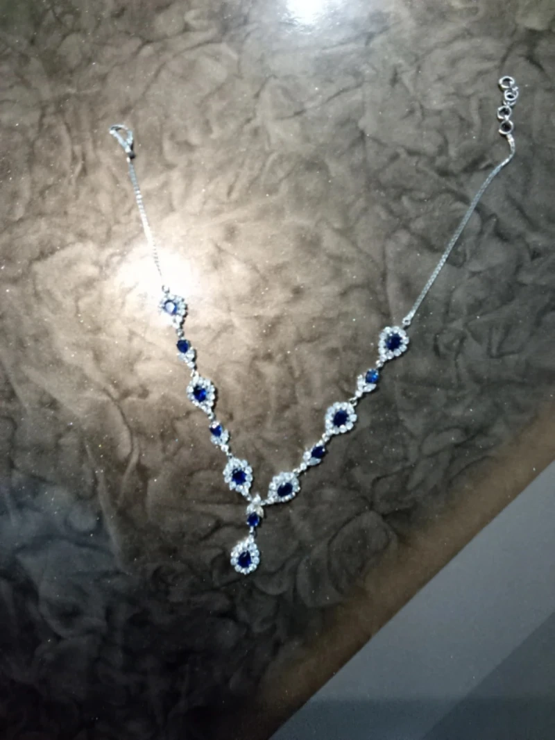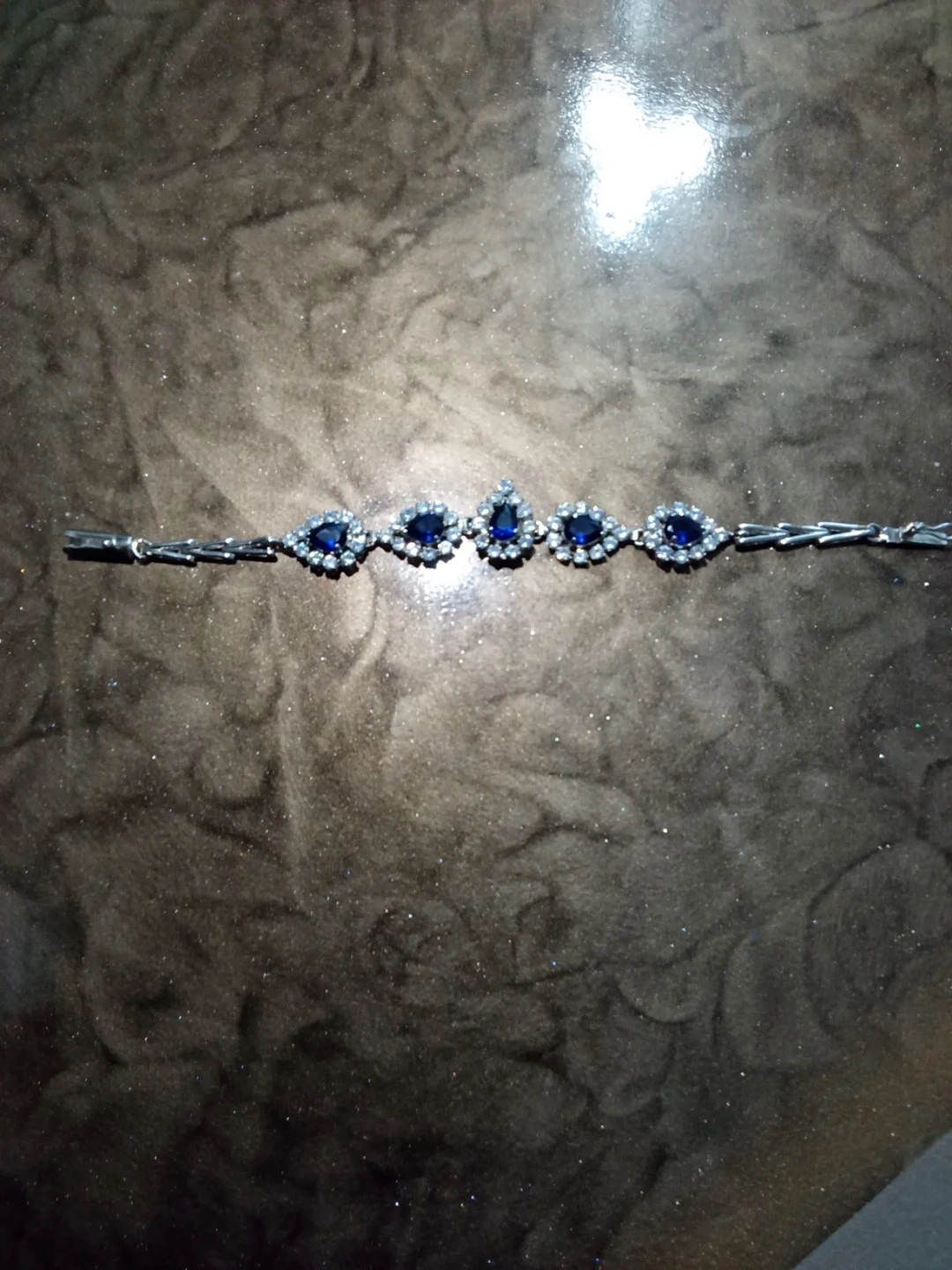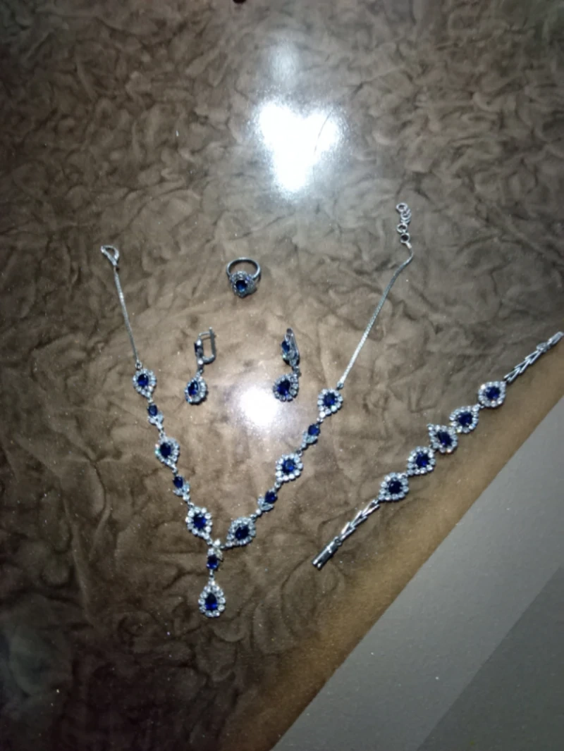 Selling a beautiful jewellery set featuring blue stones. It includes a necklace, bracelet, ring, and a pair of earrings! They're in great condition and ready to be worn for a special occasion or to add a touch of elegance to your everyday style real sliver