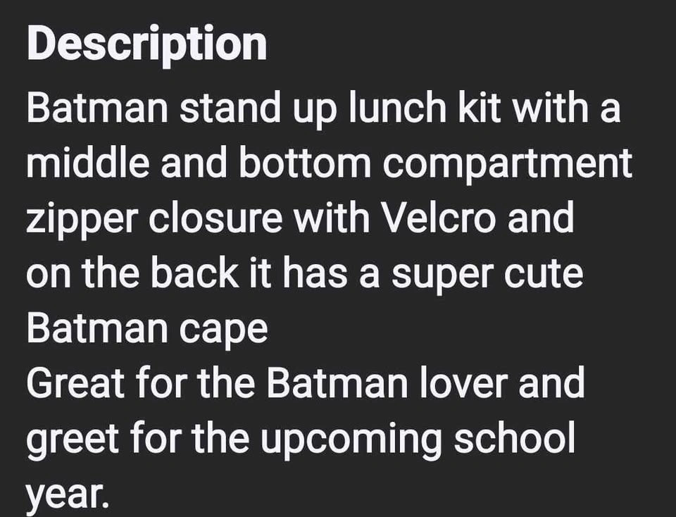 Buy & SellUpgraded Batman lunch bag w front pocket, food box & cape. ThermUpgraded Batman lunch bag w front pocket, food box & cape. Therm$7Let me know if you're interested!WHERE TO MEETCheck LocationView MapSELLERMSCity of Port Coquitlam604 reviews0 chats·0 favorites·4 viewsSEND CHAT TO SELLERHi MS! I’m interested in your listing.Hi MS! I’m interested in your listing.Get the Karrot app to chatSign In to chat