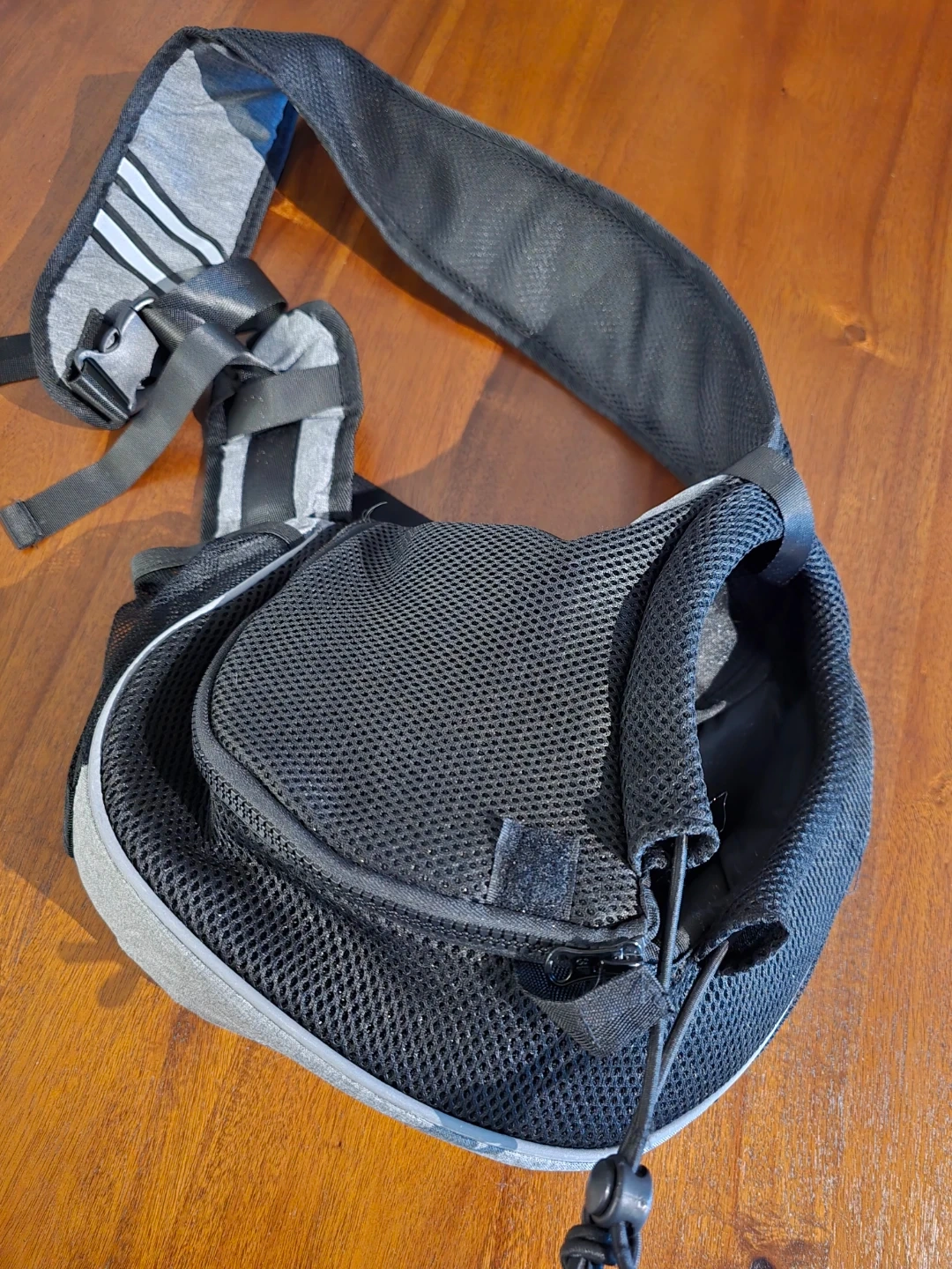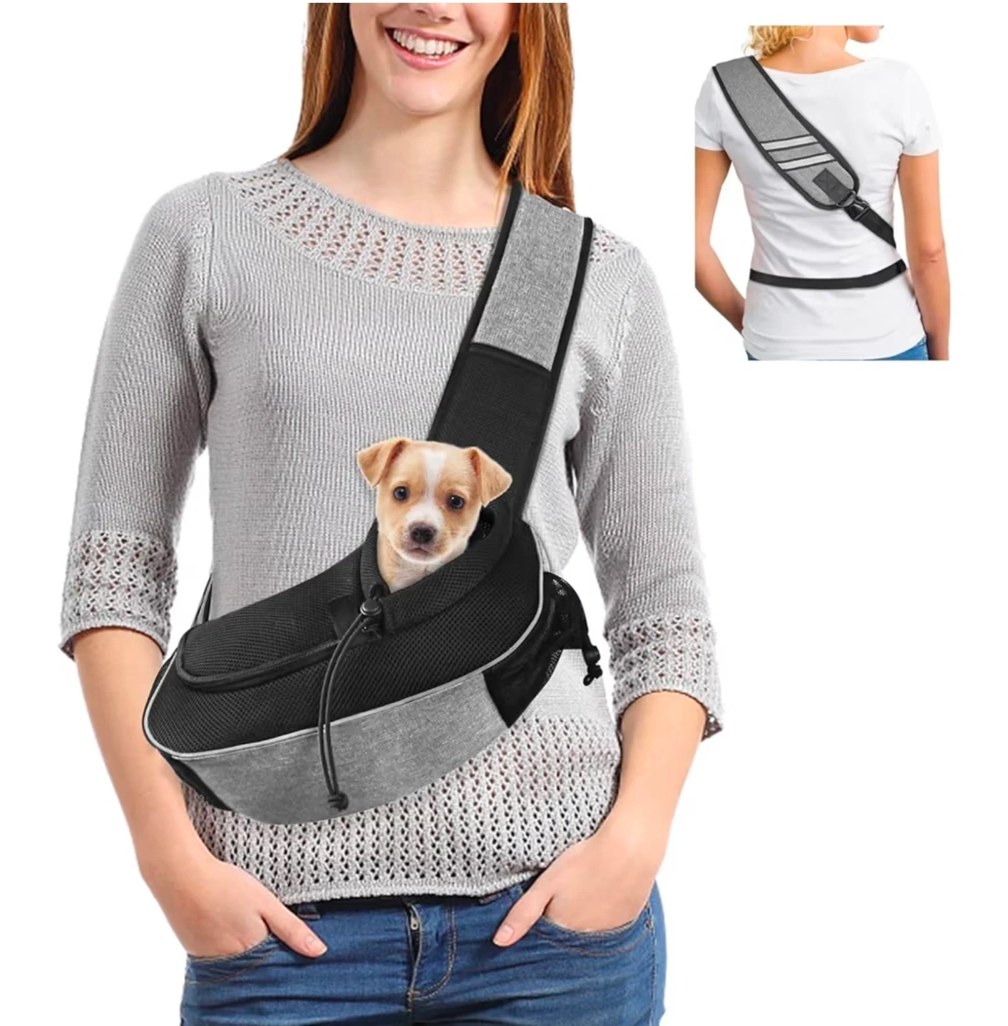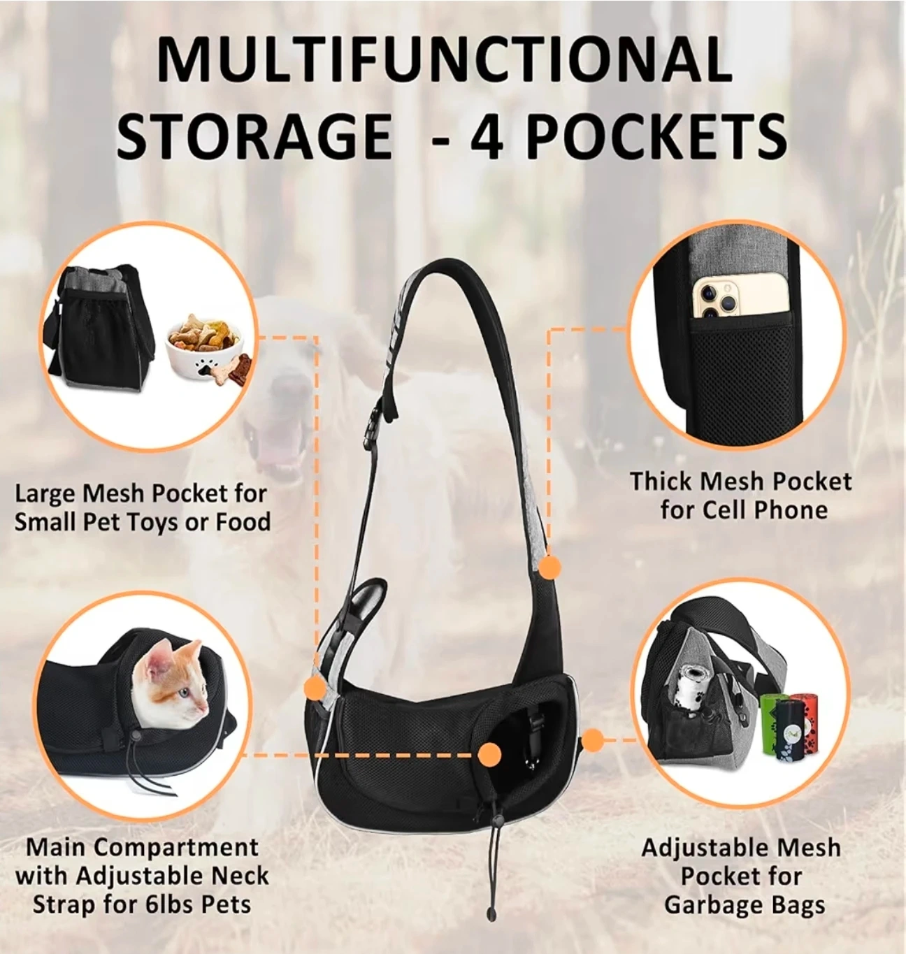 Keep your furry friend close with this comfy pet carrier sling! It's black and grey, perfect for small pets (puppies, cats). The sling has an adjustable shoulder strap (38.5"-54.3") and waist strap (up to 35.8"). It also features handy pockets for toys, treats, your phone, and even garbage bags! Barely used, in perfect condition.