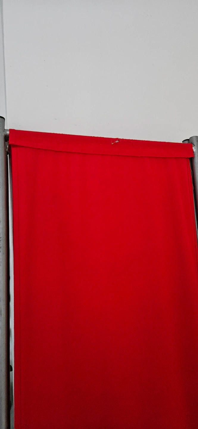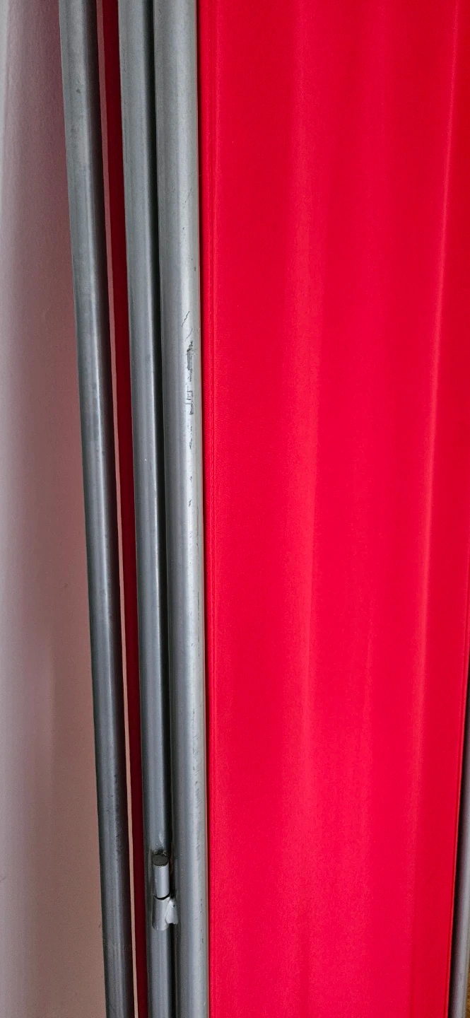 Selling a vibrant red folding privacy screen! It's great for dividing a room or creating a private space. The screen has three panels and a metal frame. There are some signs of wear on the frame.