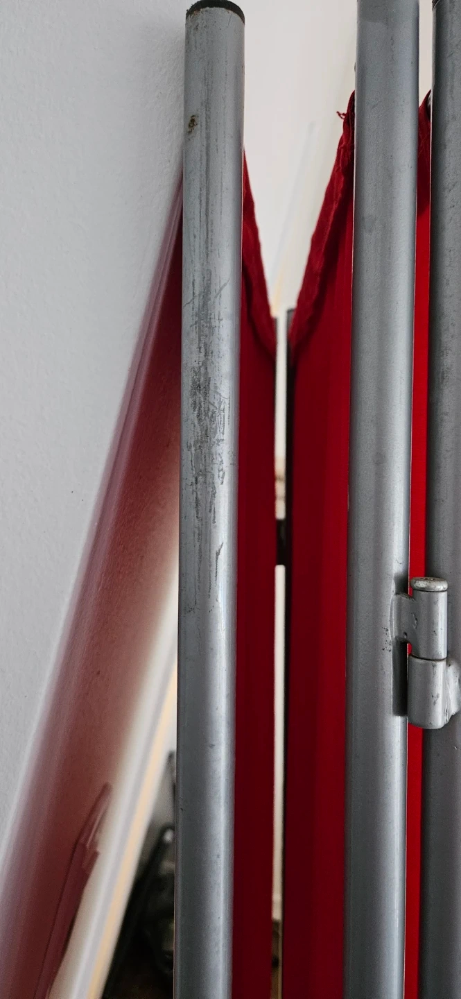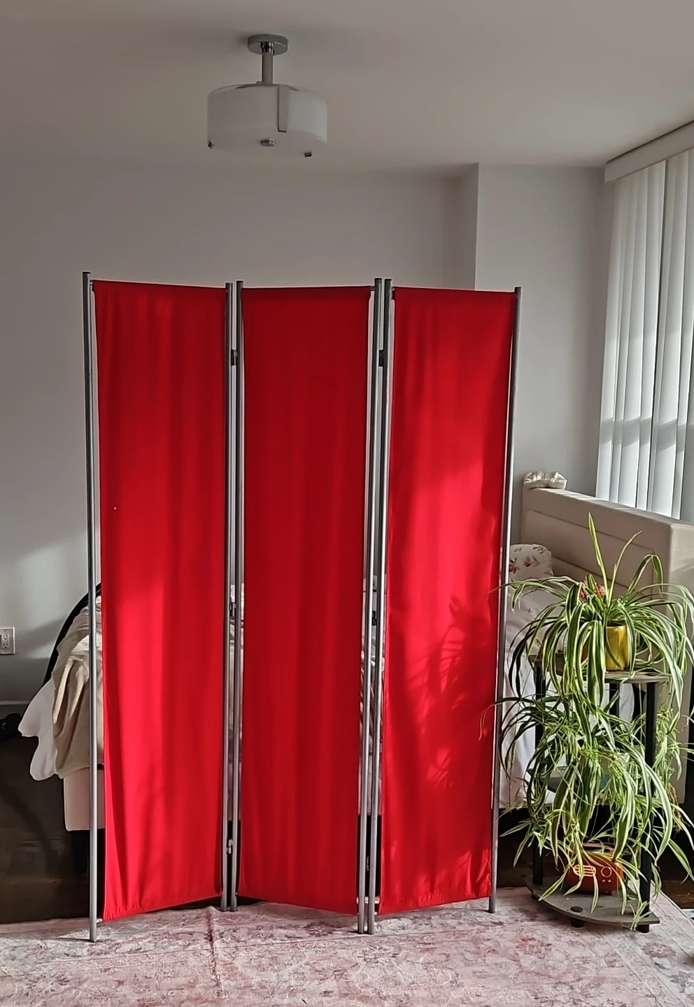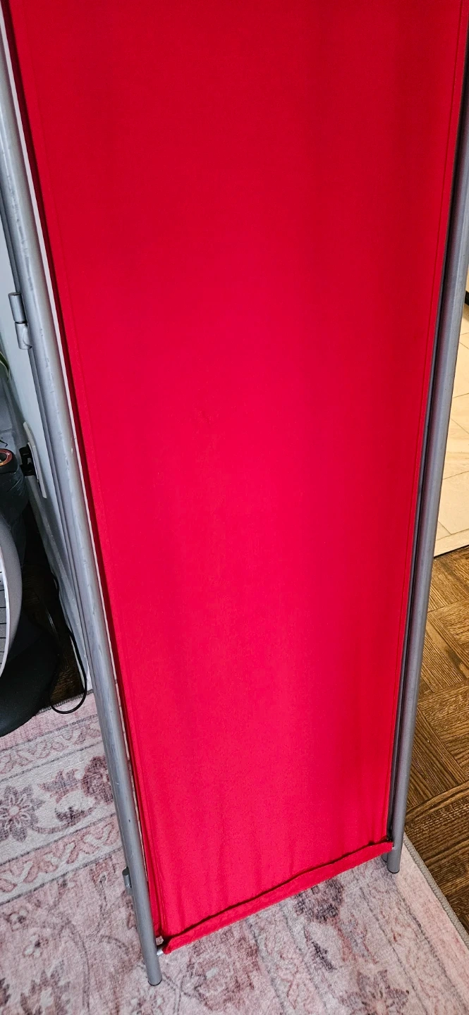 Selling a vibrant red folding privacy screen! It's great for dividing a room or creating a private space. The screen has three panels and a metal frame. There are some signs of wear on the frame.