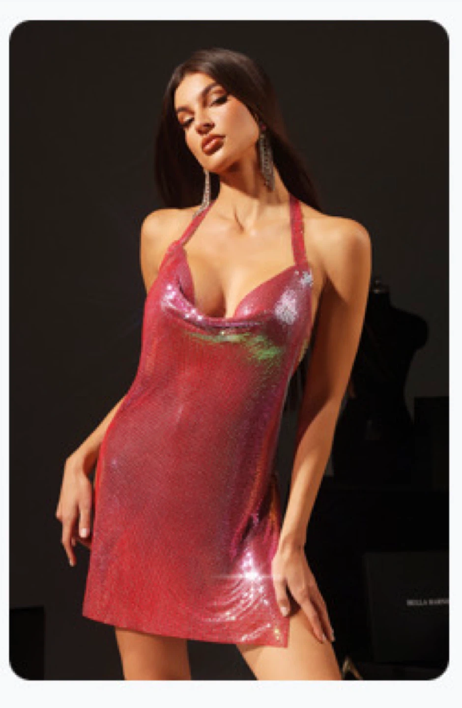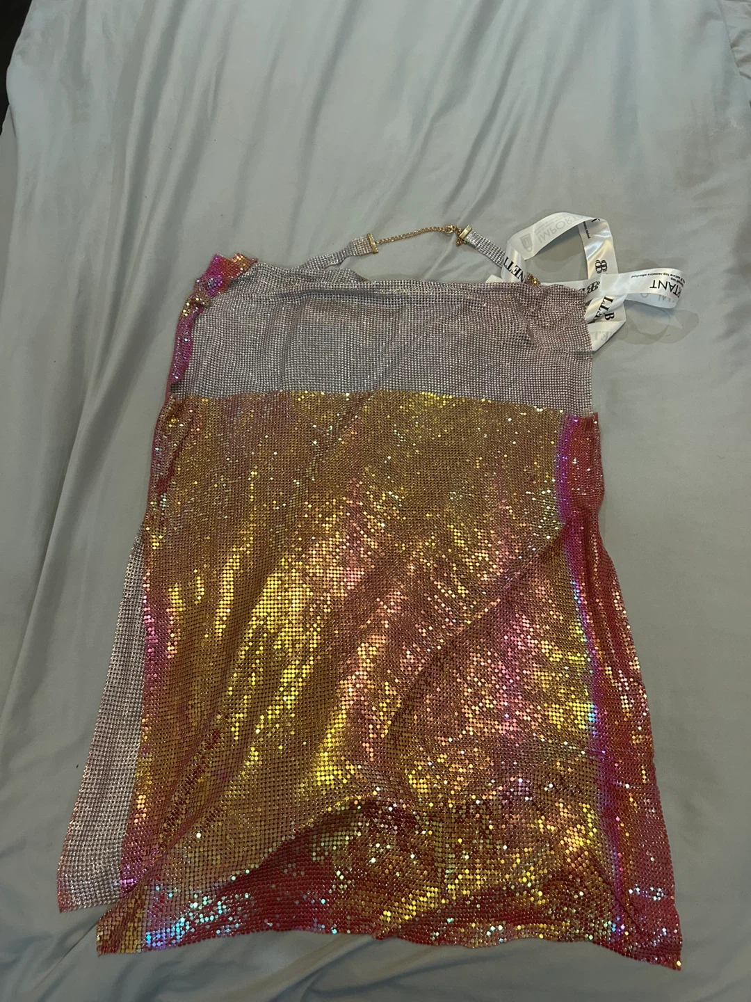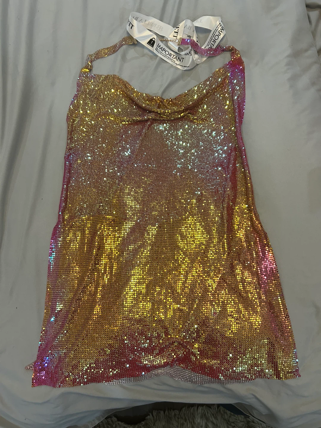 This is a Bella Barnett mesh mini dress. It's a really unique piece that catches the light beautifully! Perfect for a night out. The dress is in great condition.