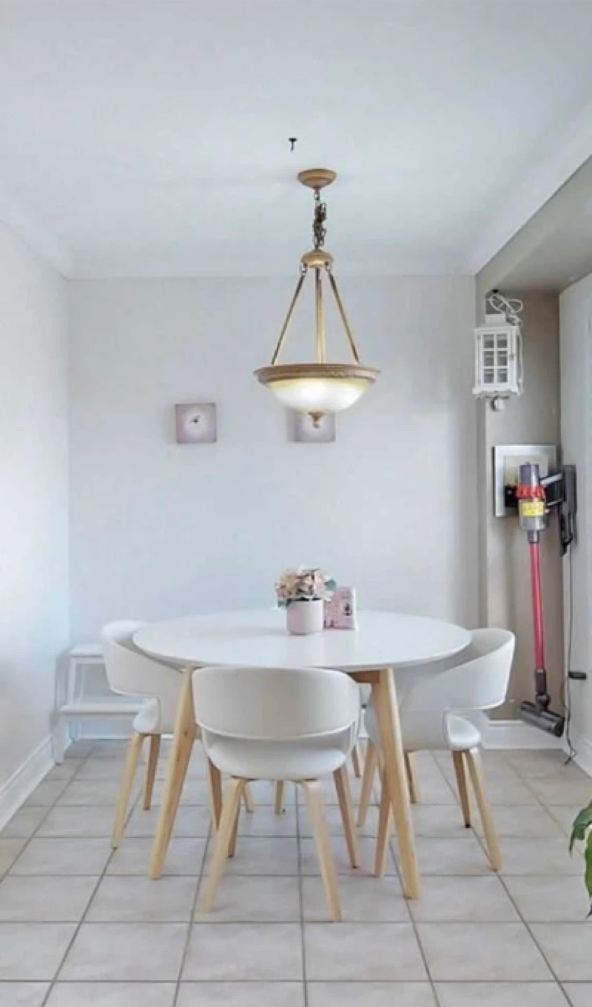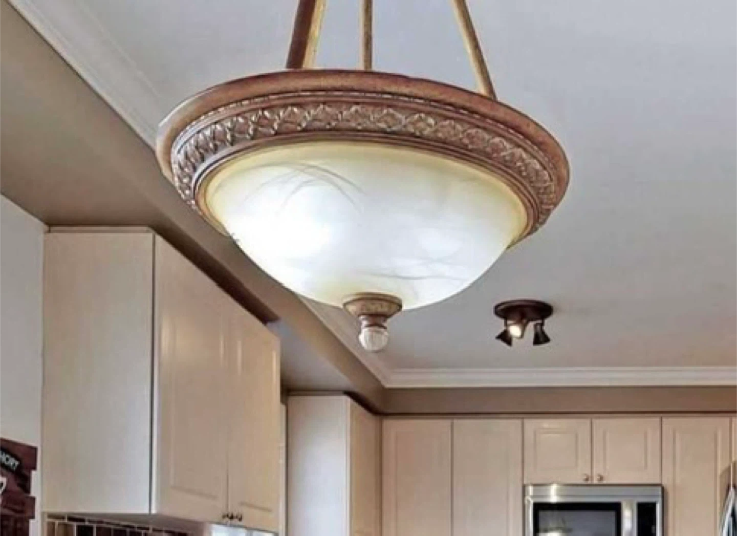 Here's a hanging ceiling light fixture! It would look great in a dining room or kitchen. It has a classic design with a round shape and decorative trim. A nice addition to any home!