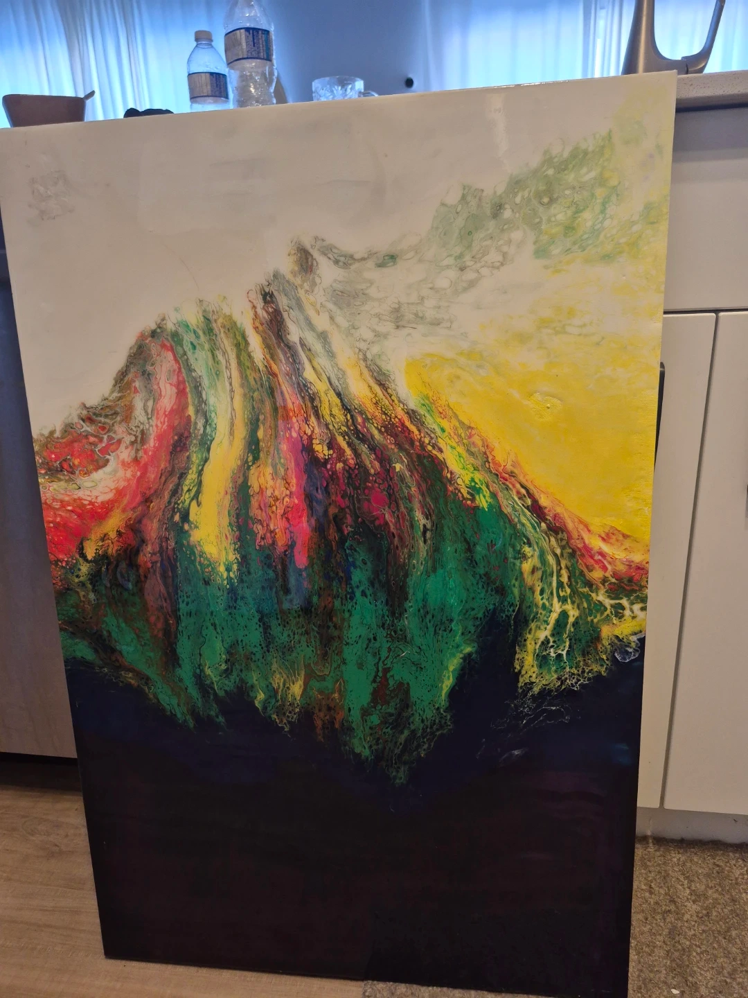 Selling a vibrant abstract art painting. 61/91 cm )It features a mix of colours including red, yellow, green, and black. It would look great in any room!