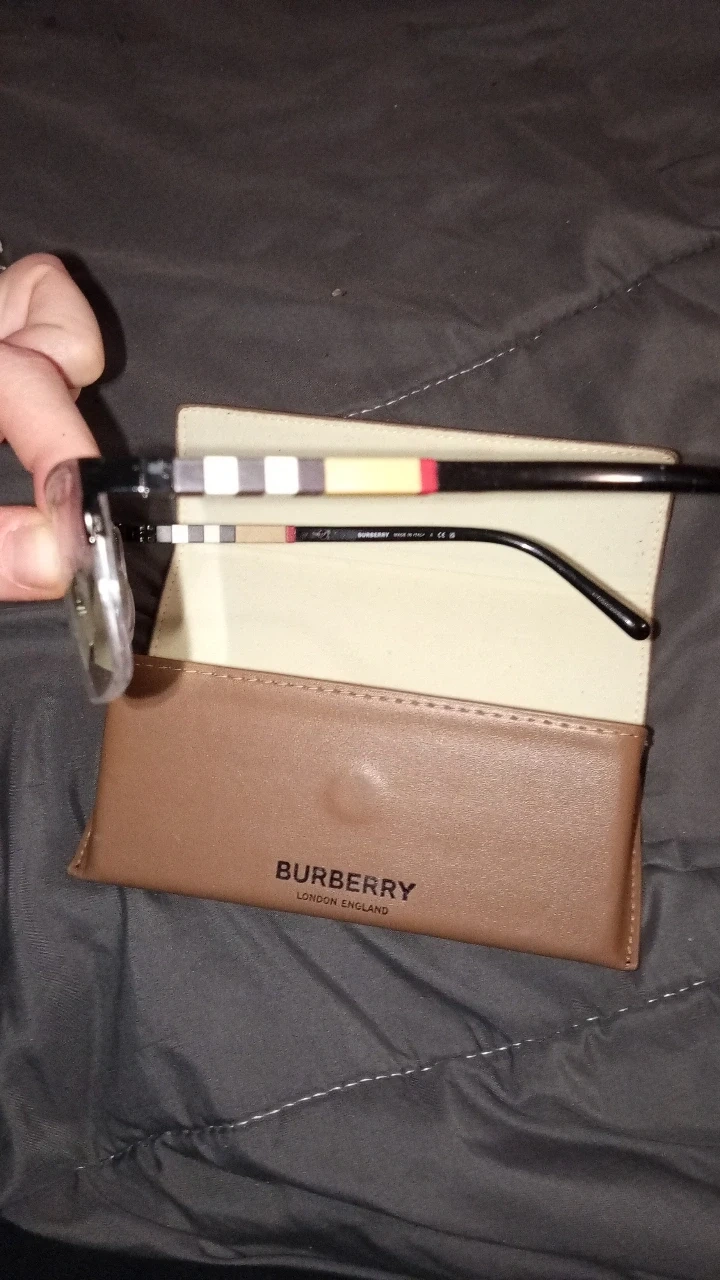 Selling a pair of Burberry eyeglasses that come with their original case. The eyeglasses have a black frame with the classic Burberry pattern on the sides. They're in great condition and ready for a new owner!