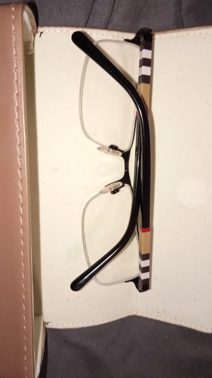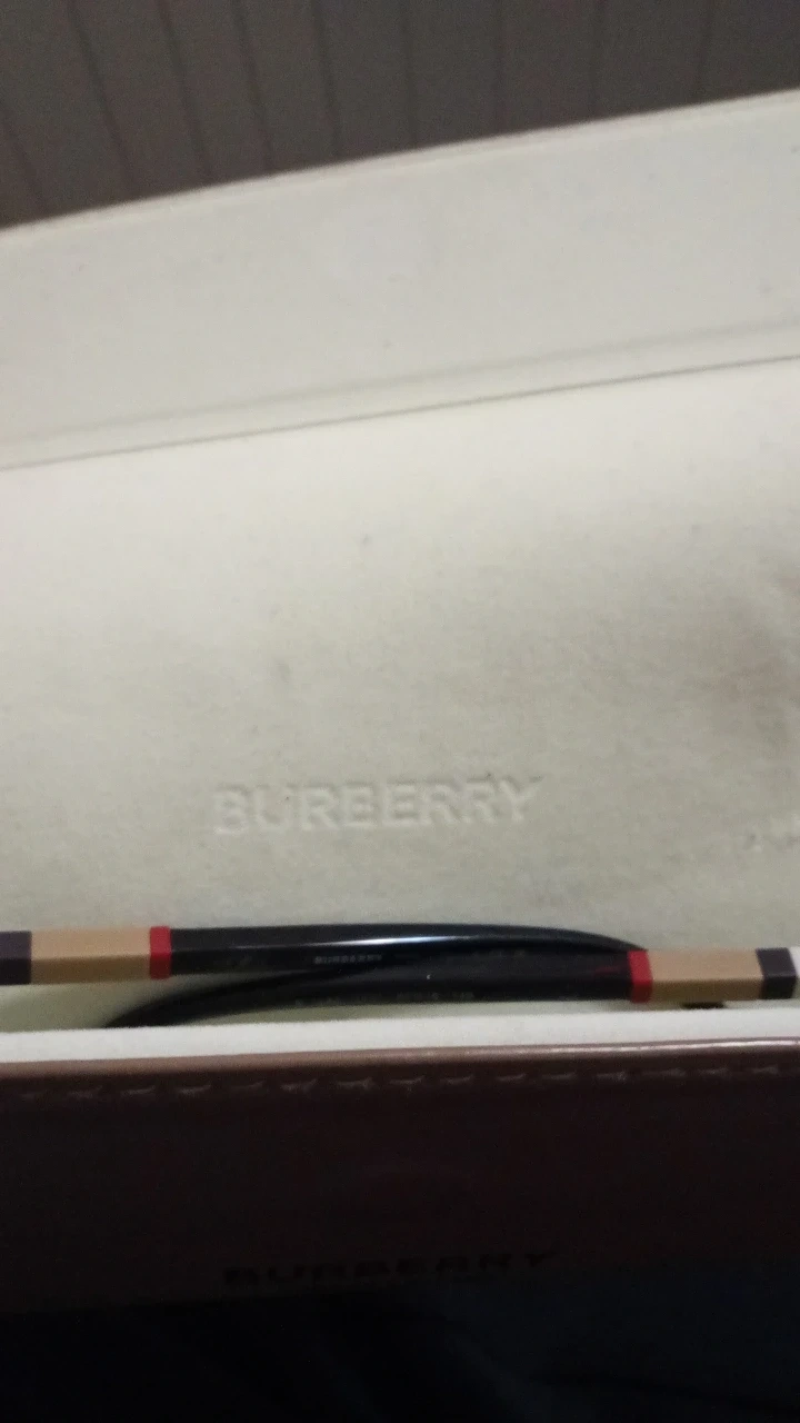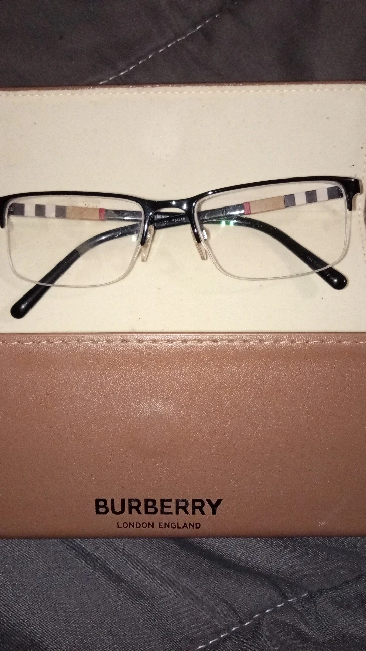 Selling a pair of Burberry eyeglasses that come with their original case. The eyeglasses have a black frame with the classic Burberry pattern on the sides. They're in great condition and ready for a new owner!