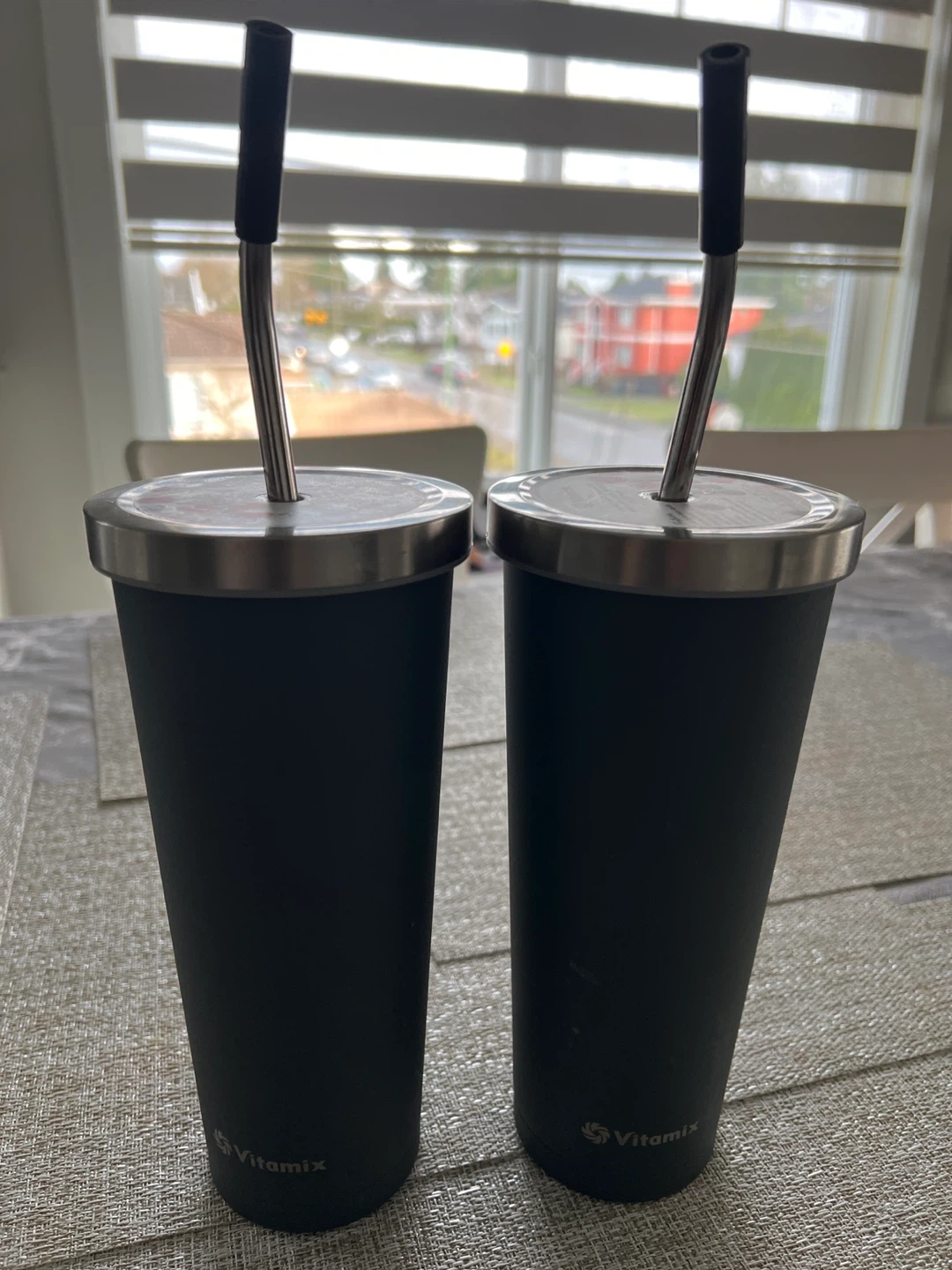 Selling a set of two Vitamix tumblers. They are double-wall insulated and hold 24 oz (709 mL). They feature a stainless steel straw, silicone sealed stainless steel lid, and are BPA free. The smart straw is removable for easy cleaning
