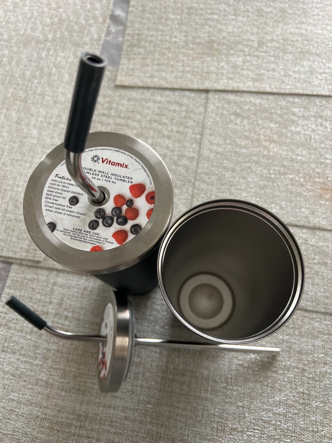 Selling a set of two Vitamix tumblers. They are double-wall insulated and hold 24 oz (709 mL). They feature a stainless steel straw, silicone sealed stainless steel lid, and are BPA free. The smart straw is removable for easy cleaning
