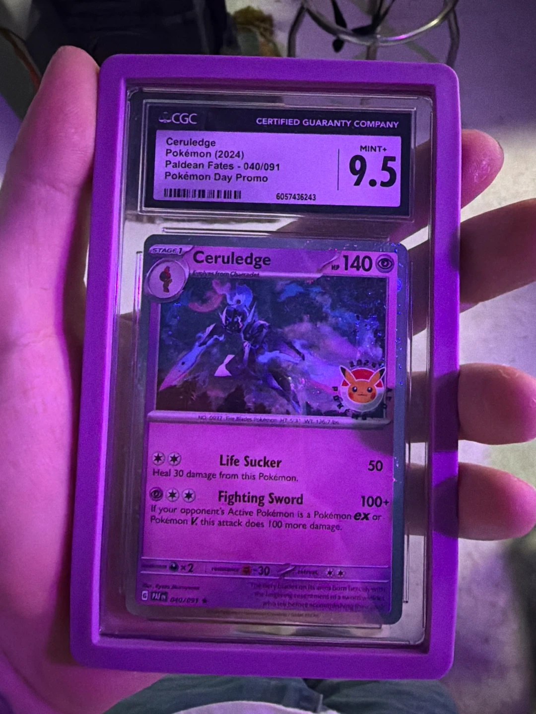 Selling a CGC graded Ceruledge Pokémon card from the Paldean Fates series! It's a 2024 Pokémon Day Promo, graded Mint+ 9.5 by CGC. A great addition to any collection!