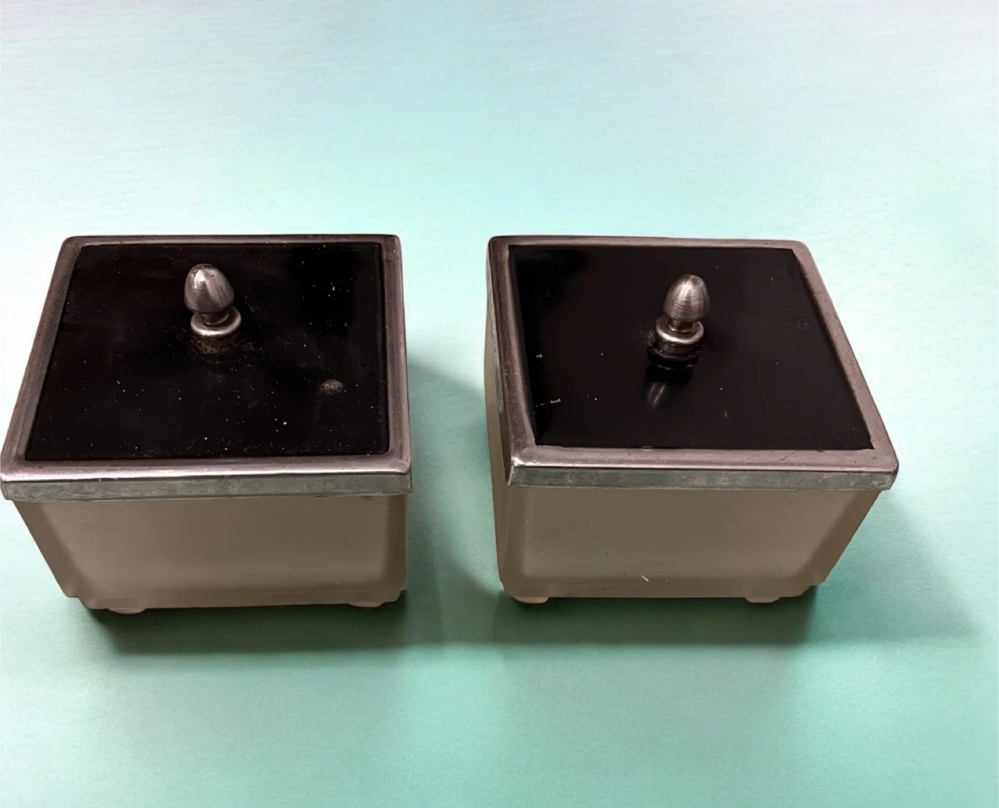 Selling a set of two vintage boxes. They feature a frosted glass base and a sleek black lid, adding a touch of retro charm to any space. Perfect for storing small items or as decorative pieces! Some scratches and marks.