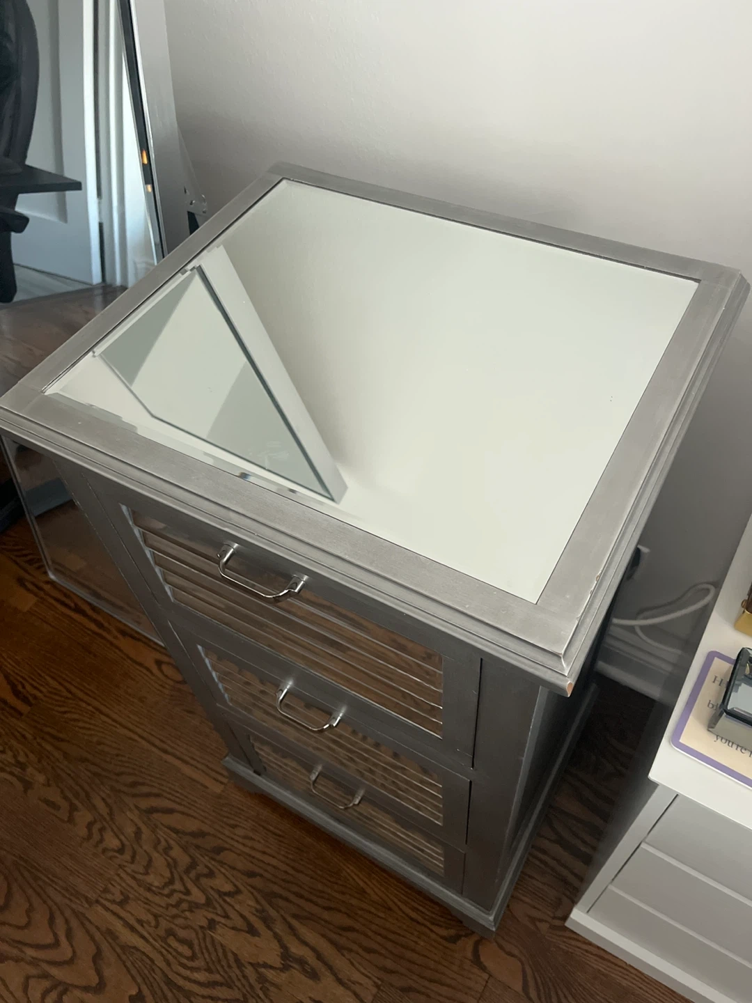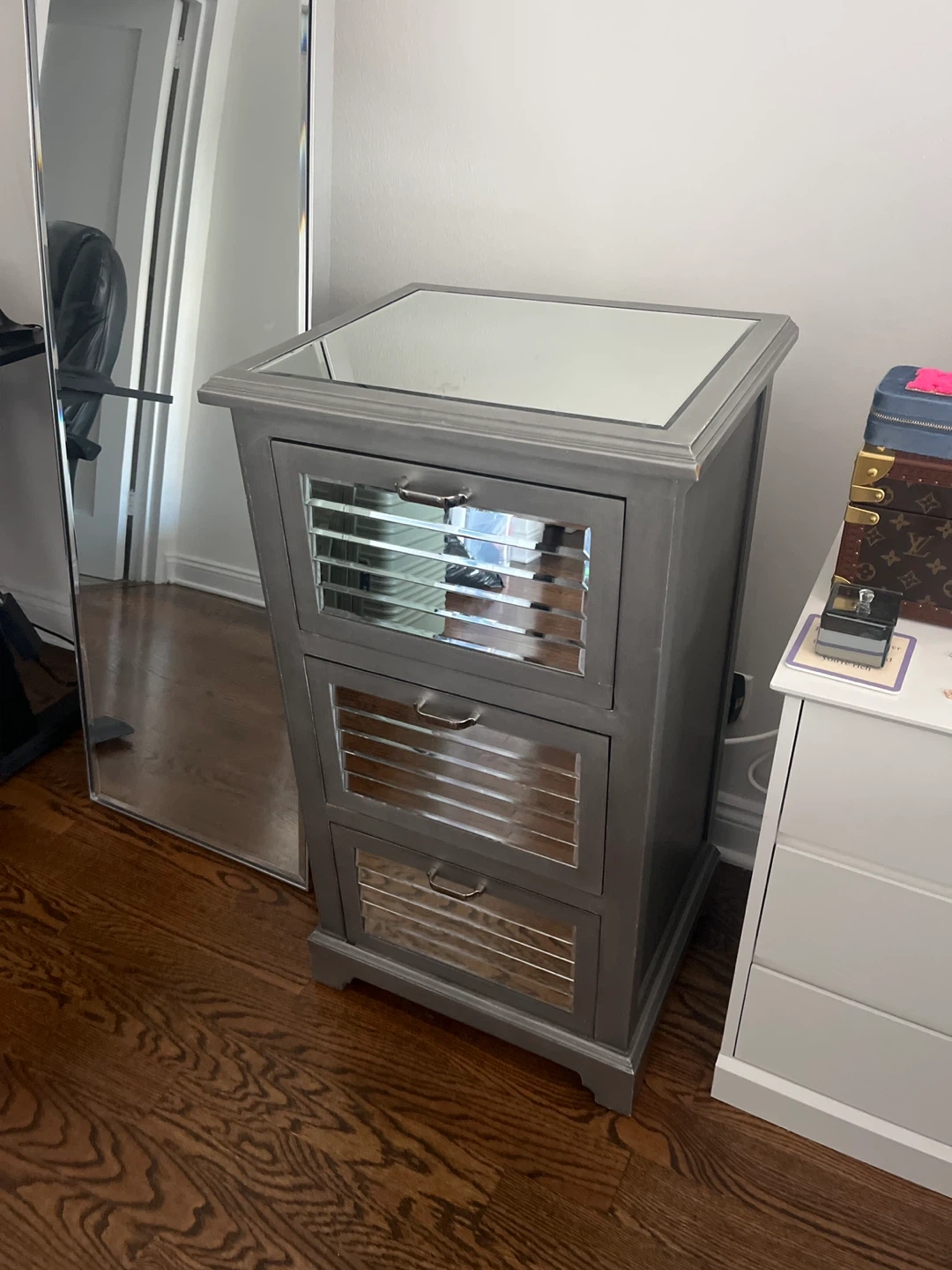This is a gray mirror nightstand with three deep drawers and mirrored fronts. It would be a nice addition to any bedroom! Originally $150.