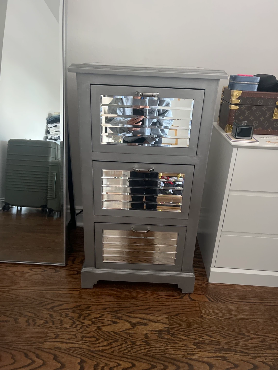 This is a gray mirror nightstand with three deep drawers and mirrored fronts. It would be a nice addition to any bedroom! Originally $150.