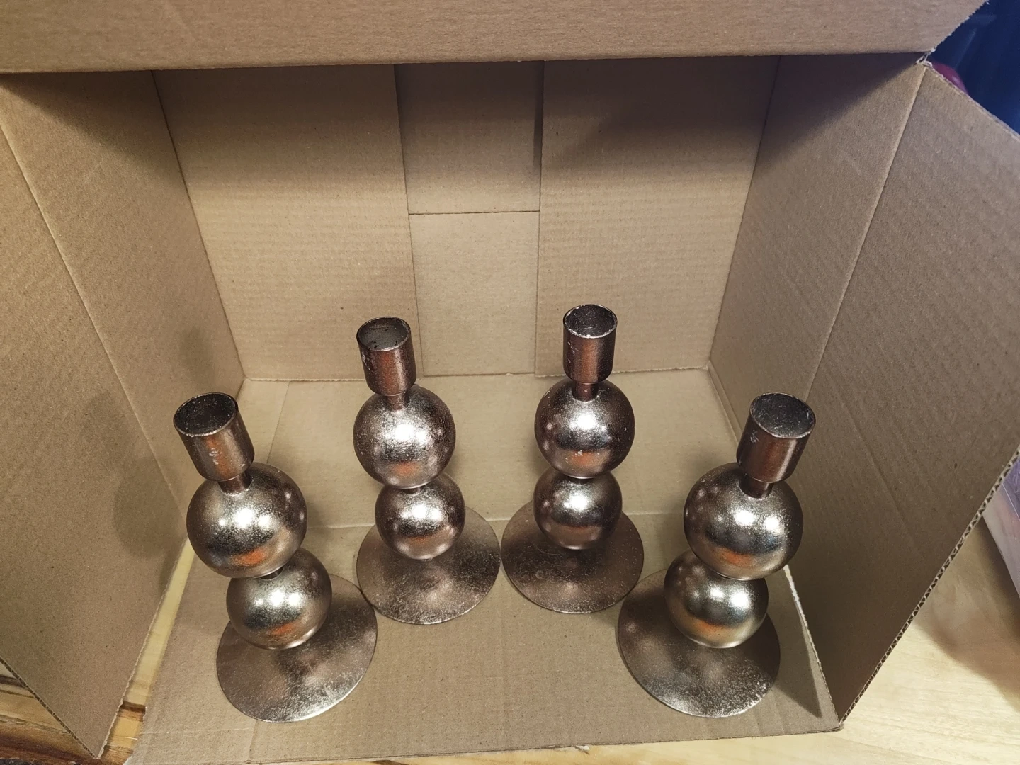 Selling a set of four metal candlestick holders. They have a unique spherical design and are in good condition. Perfect for adding a touch of modern elegance to your home decor! Normally $24.99 each selling set /4 for $20