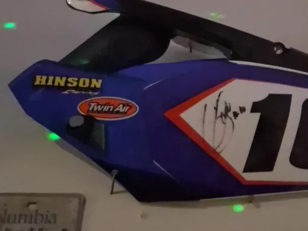 Selling a Hinson Racing dirt bike part with a Twin Air logo. It's blue and has the number 10 on it, along with a signature. Let me know if you're interested!