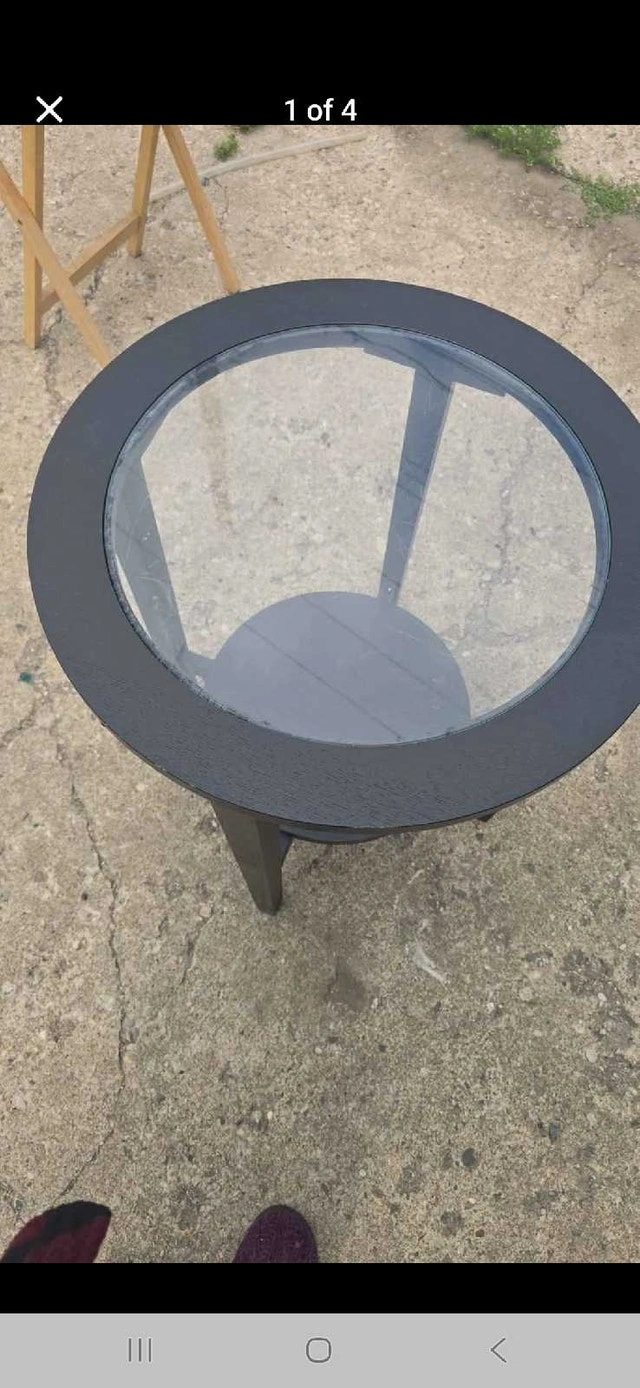 This is a round, black end table with a glass top. It features a sturdy build and a convenient lower shelf for extra storage or decor. This table is previously loved.
