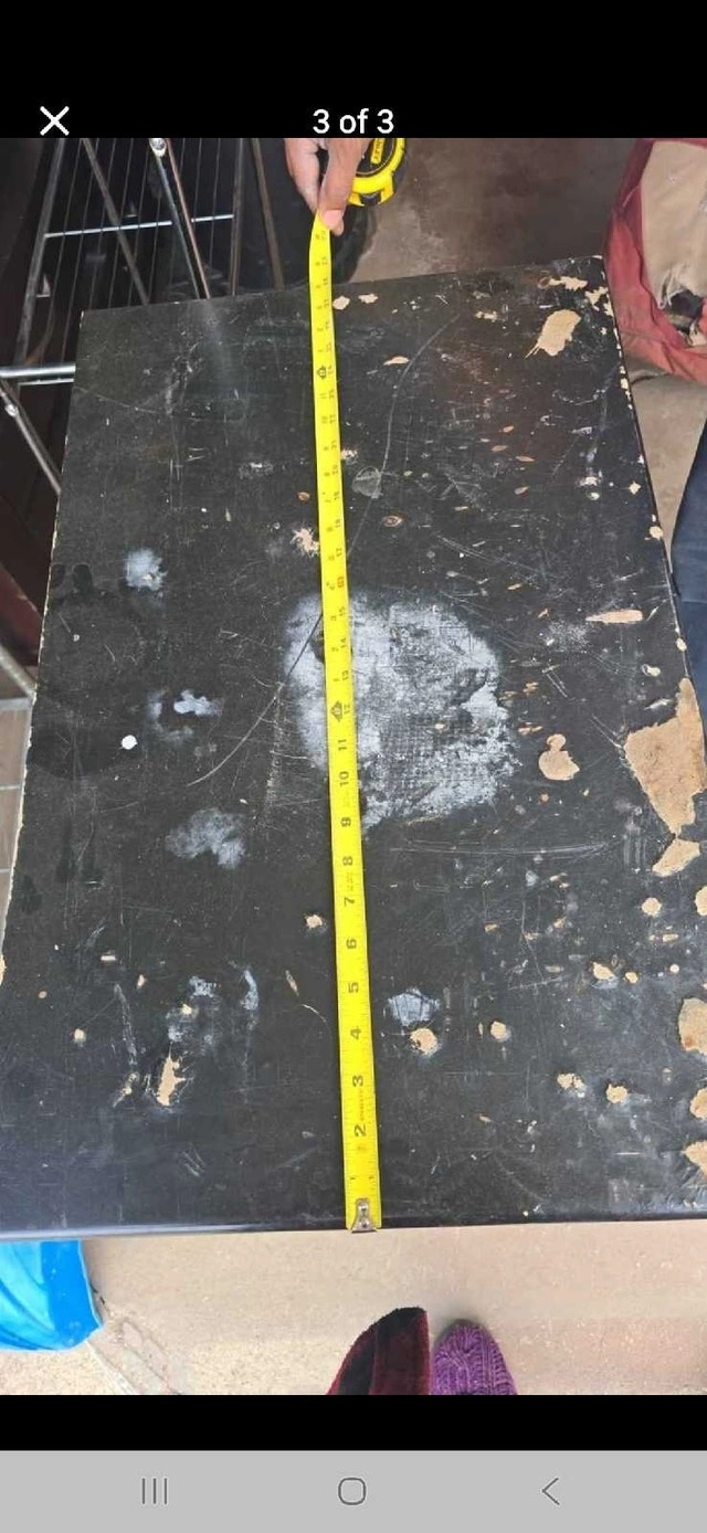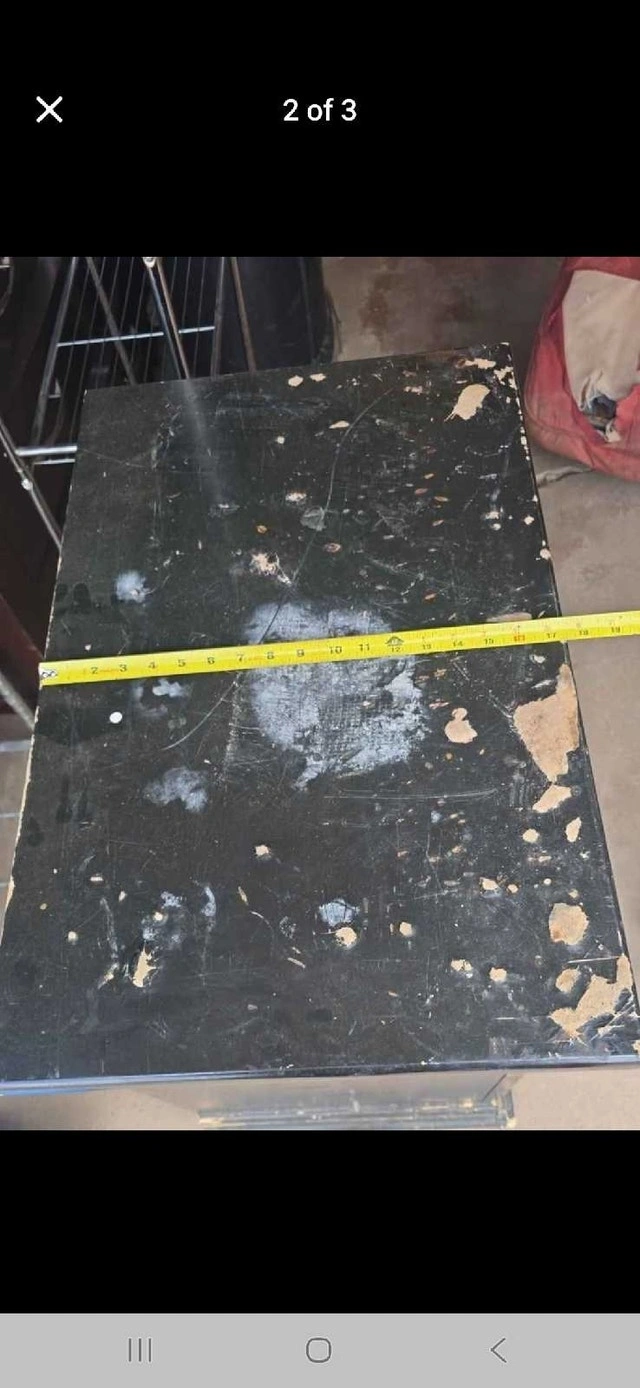 This black nightstand offers storage with a drawer and cabinet, measuring approximately 20 inches wide, 16 inches deep, and 24 inches tall, perfect for any bedroom setup. As you can see from the pictures, this is a used nightstand and shows cosmetic wear and tear, but could be restored with some work. A similar nightstand on Kijiji sells for $75-$150 dollars, but because of the poor condition of this nightstand, I am asking $40. If the ad is up, the nightstand is still available!