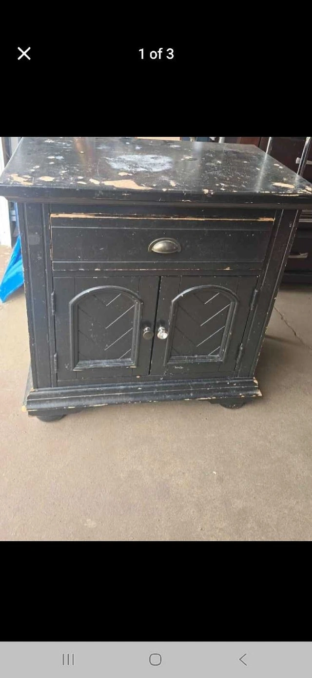 This black nightstand offers storage with a drawer and cabinet, measuring approximately 20 inches wide, 16 inches deep, and 24 inches tall, perfect for any bedroom setup. As you can see from the pictures, this is a used nightstand and shows cosmetic wear and tear, but could be restored with some work. A similar nightstand on Kijiji sells for $75-$150 dollars, but because of the poor condition of this nightstand, I am asking $40. If the ad is up, the nightstand is still available!