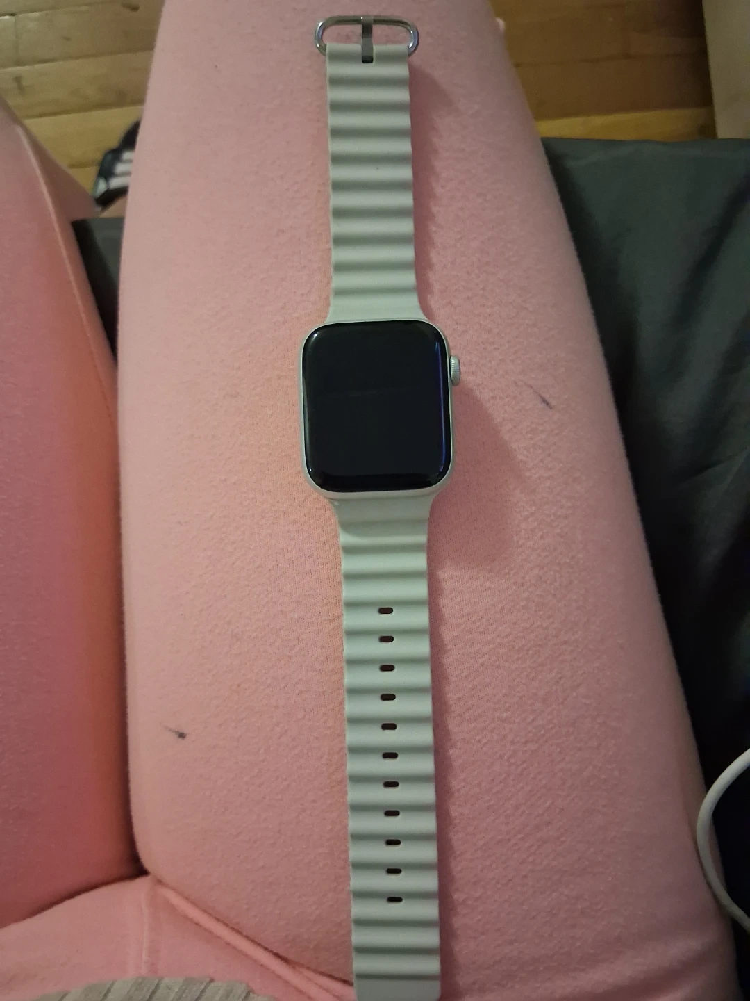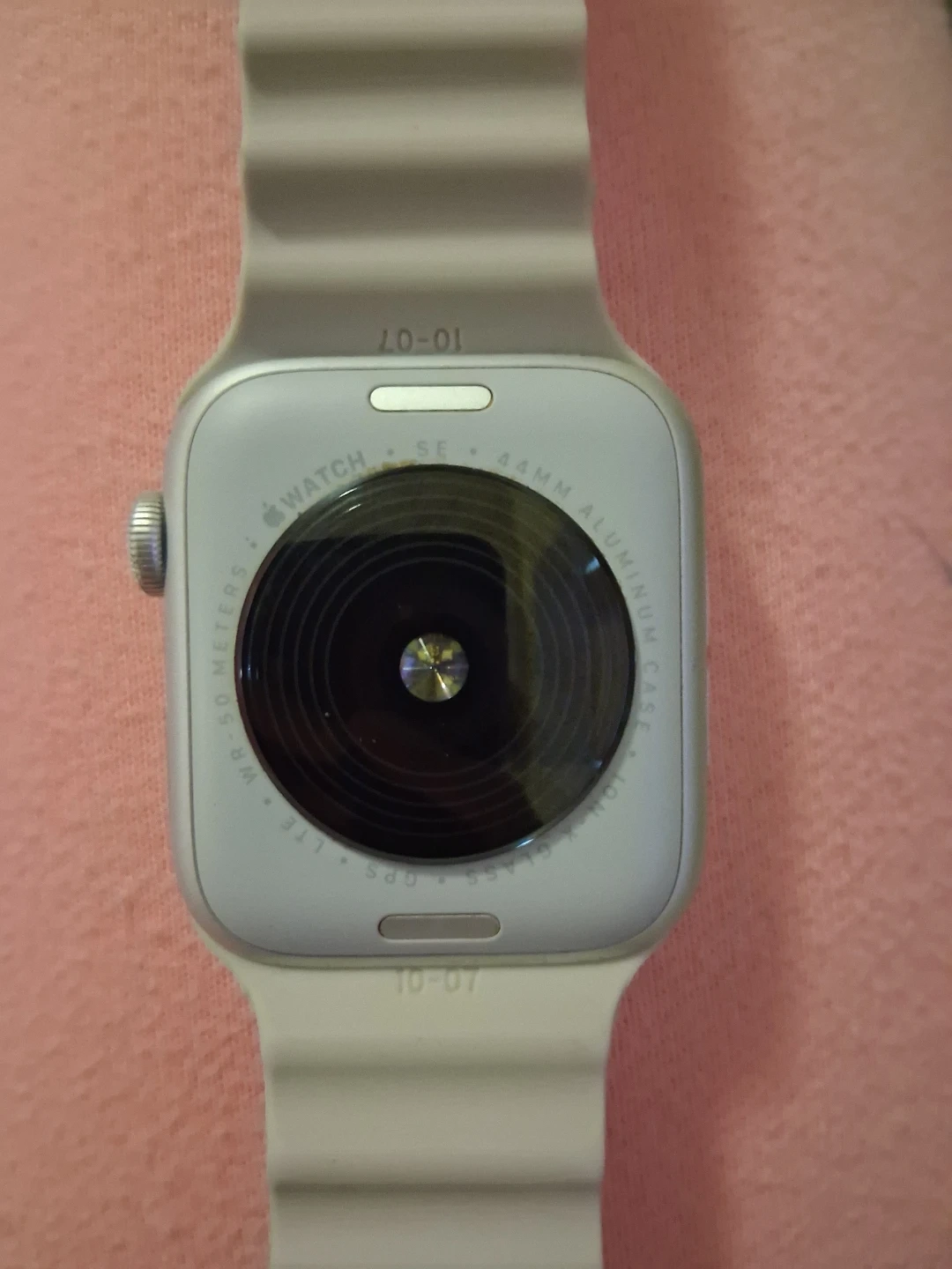 Selling an Apple Watch SE with a 44mm aluminum case. It's in great condition and ready for a new owner! The band is a light color, perfect for everyday wear.