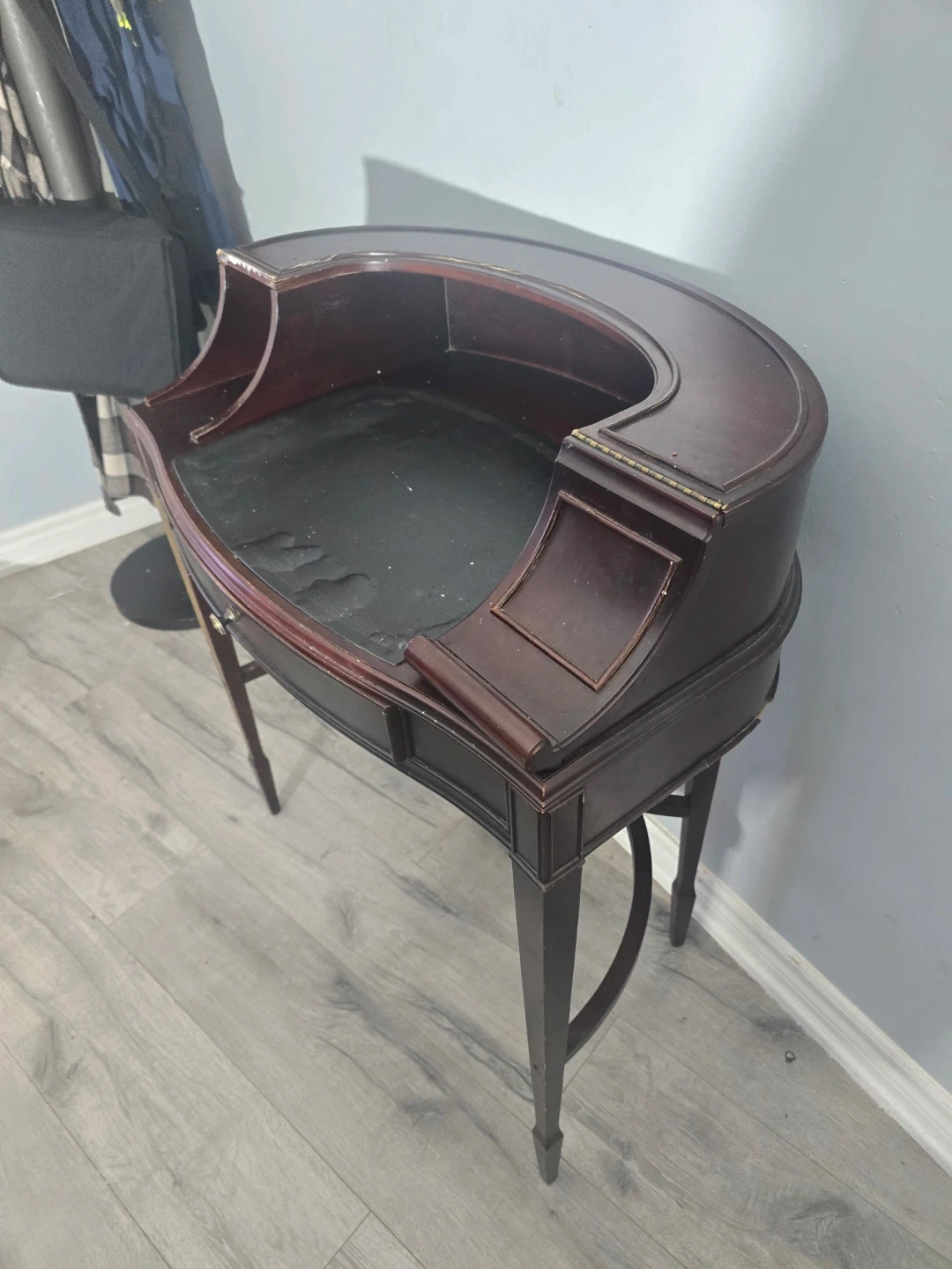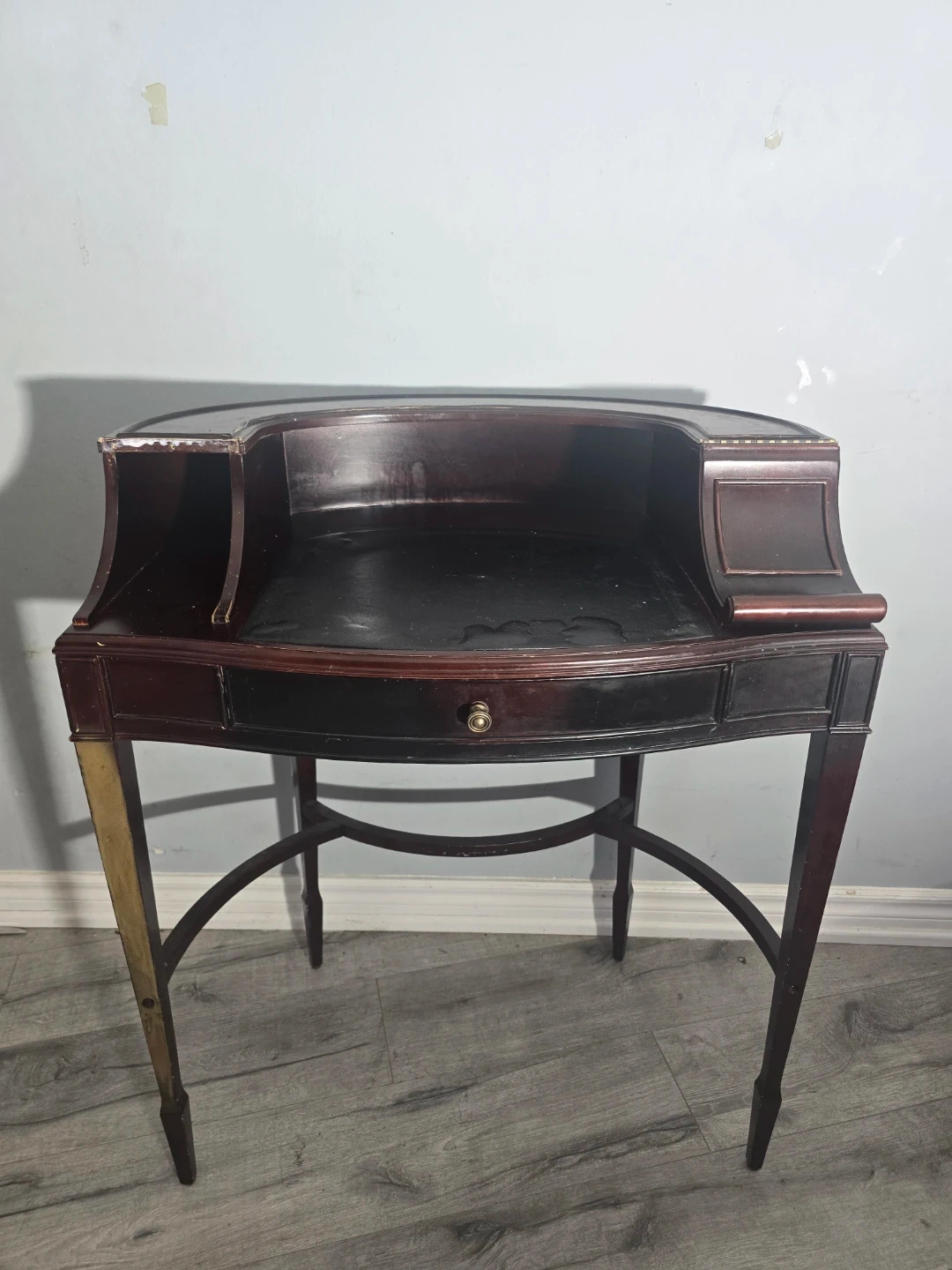 Selling an antique mahogany writing desk. It features a curved design with a black leather writing surface and a small drawer. The desk has some wear and tear, but it's still a beautiful and functional piece of furniture.