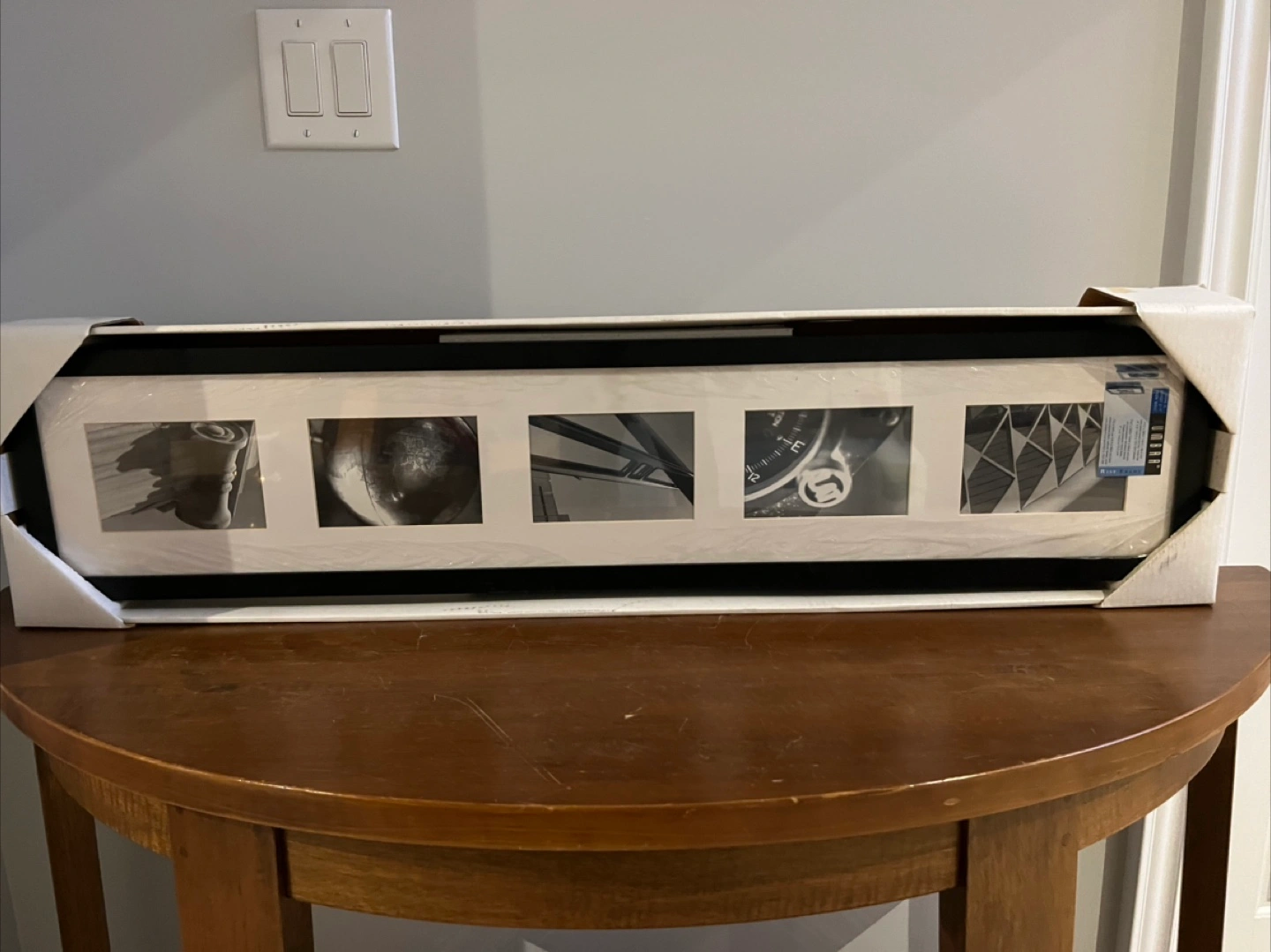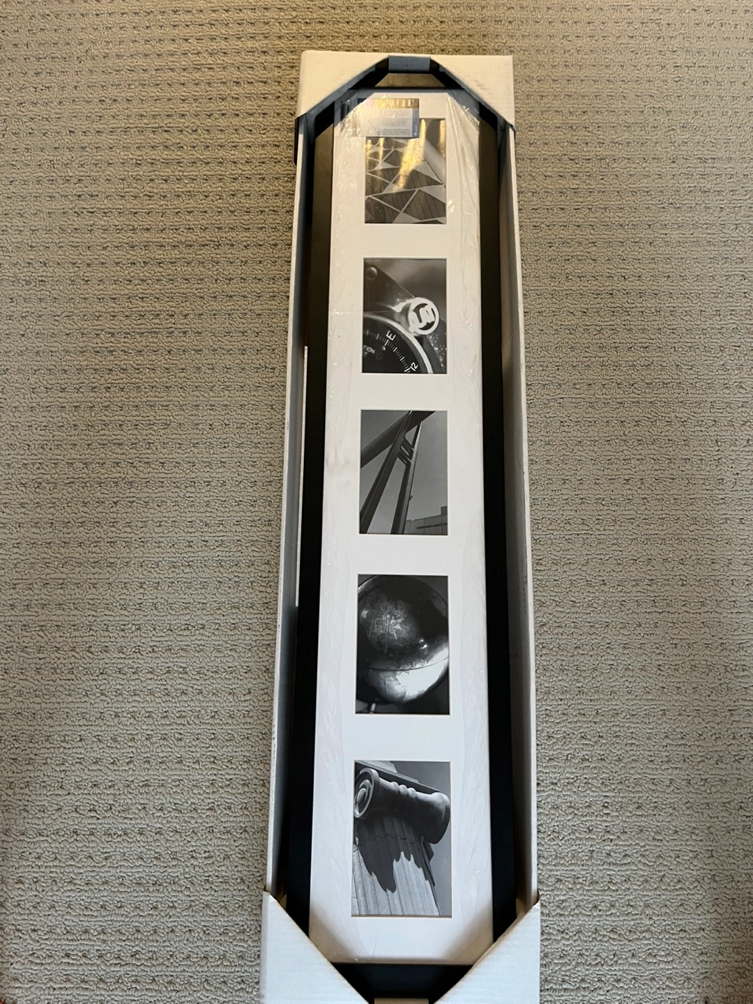 I'm selling a brand new Umbra Rise Frame, still in its original packaging! This frame is designed to hold five 4" x 6" photos with a white bevel-cut mat. It measures 7 1/4" x 38 3/4" and is offset 2 1/4" from the wall. A great way to display your favourite memories!