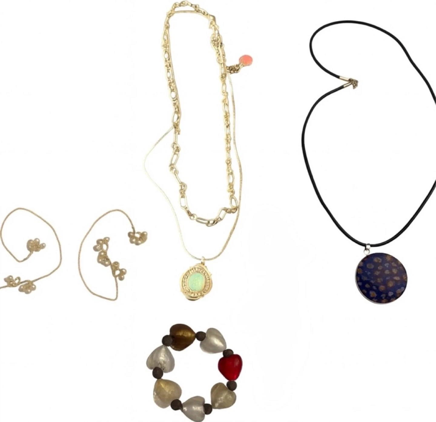 Add instant charm to your collection with this curated 4-piece jewelry bundle featuring: 💙 A bold turquoise pendant on a layered gold chain 🖤 A round blue floral pendant on a black cord necklace 💫 Delicate pearl-cluster earrings with gold wire hooks ❤️ A bead bracelet with warm tones and eclectic flair Perfect for gifting, bundling, or adding sparkle to your own style. Each piece is unique, versatile, and boutique-approved.