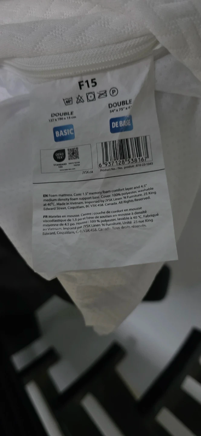 Selling a double size foam mattress from JYSK. It's a Basic De Base model, measuring 54" x 75" (137 x 190 x 11.5 cm). The core is made of 1.5" memory foam comfort layer and 4.5" high density support base, with 100% polyester cover.