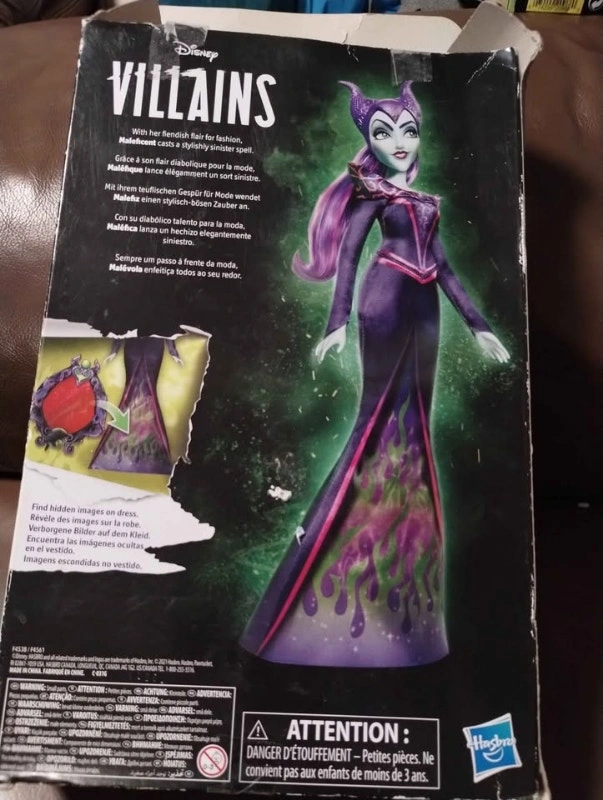 The villainess from Disney's Sleeping Beauty is an approximately 11-inch fashion doll with a stunning outfit and accessories. In her full-length gown with flame décor, this Disney Villains doll cuts a devilishly fashionable appearance.