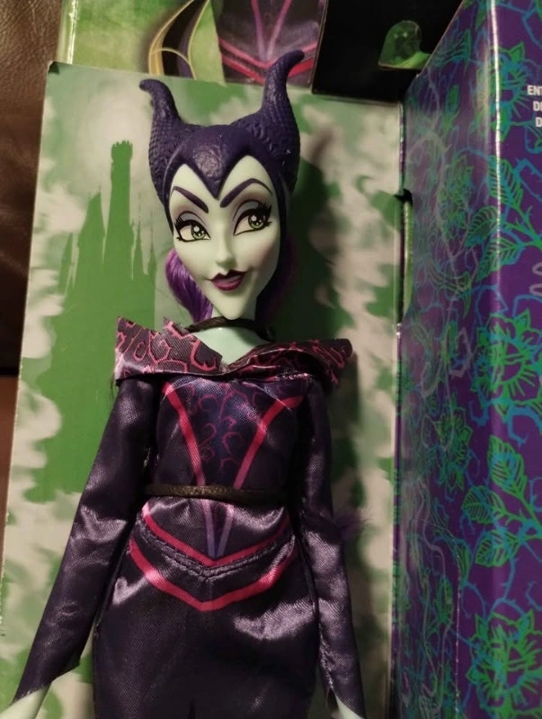The villainess from Disney's Sleeping Beauty is an approximately 11-inch fashion doll with a stunning outfit and accessories. In her full-length gown with flame décor, this Disney Villains doll cuts a devilishly fashionable appearance.