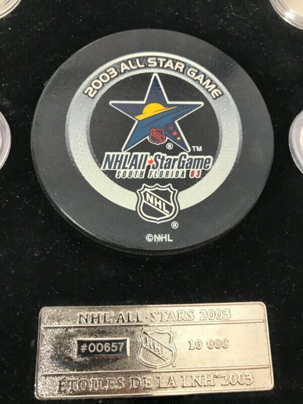 2003 NHL All-Star Commemorative Stamp and Medallion Set. Includes Medallions & stamps commemorating Frank Mahovlich, Serge Savard, Mike Bossy, Raymond Bourque, Stan Mikita, & Bill Burnan with South Florida All Star Puck. Comes in deluxe display with COA