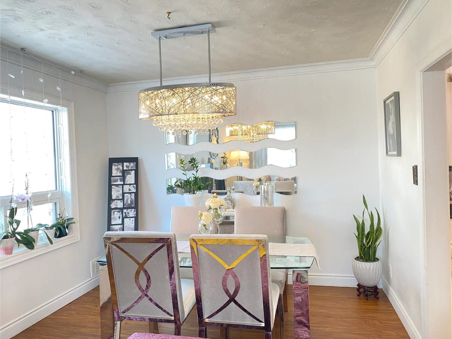 Selling a 63 inches glass dining table with four chairs! The table has a clear glass top and chrome legs. The chairs are upholstered in a light beige fabric with a chrome frame. It's perfect for a modern dining space!
