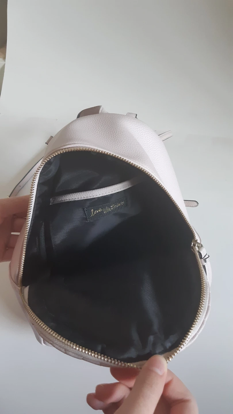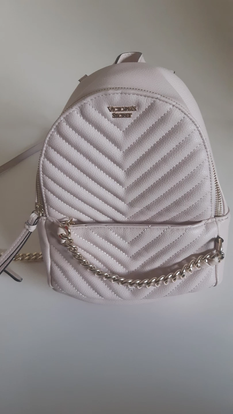 This is a cute pink backpack from Victoria's Secret. It has a chevron pattern on the front and gold chain details on the straps. The interior is black.